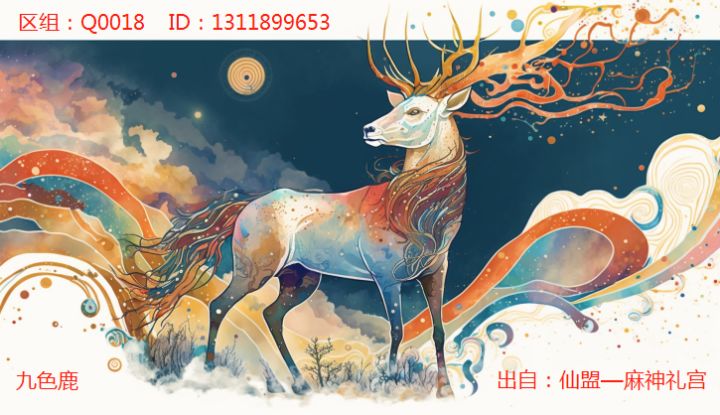 【幻灵设计大赛】九色鹿—————————区组:Q0018ID:1311899653设计理念:源自于民间神话故事《九色鹿》,它总会在人们受难之时提供救助,被人们称为神鹿,就像我们的仙剑少侠们一路荆棘坎坷,困难重重,需要这样一只神兽辅助其右,一路荡平魑魅魍魉。