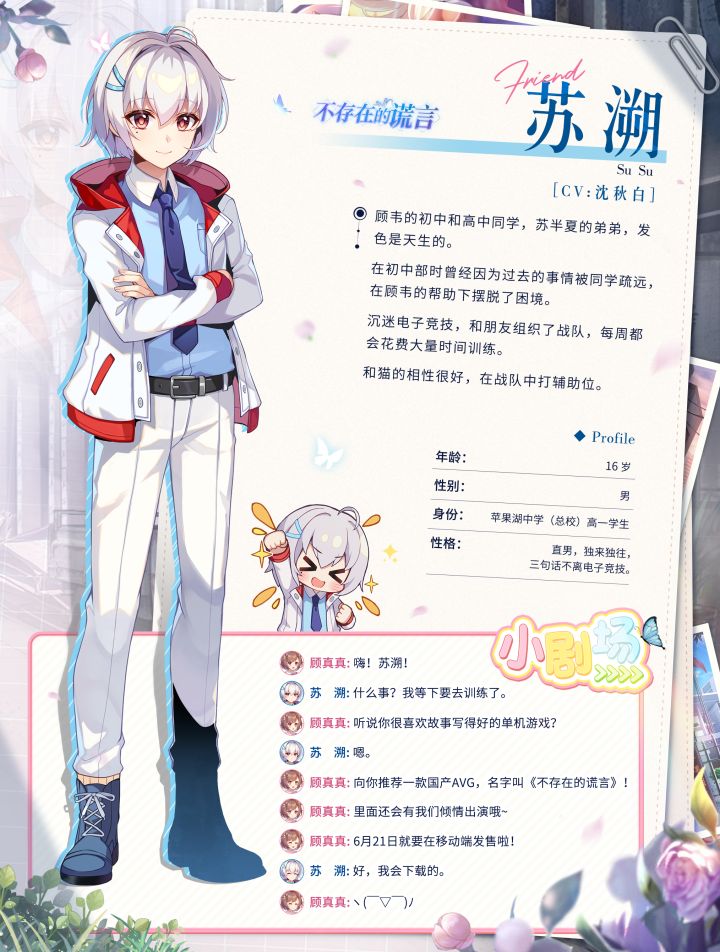 呀呼~欢迎大家回到小瞳的直播间!今天登场的这位虽然不是非日常部的成员,但也在故事中担任了非常重要的角色呢~作为苏半夏的弟弟,小瞳觉得他们性格完全不像嘛……热爱电子竞技这种事,不知道半夏是怎么看待的呢?没想到这样的外表下隐藏着一颗“网瘾少年”的心!小瞳也很期待他能够成为职业选手呢!大家对苏溯又有着怎样的印象呢?(严禁剧透!)欢迎在评论区分享给小瞳哦~小瞳将于6月23日通过TapTap