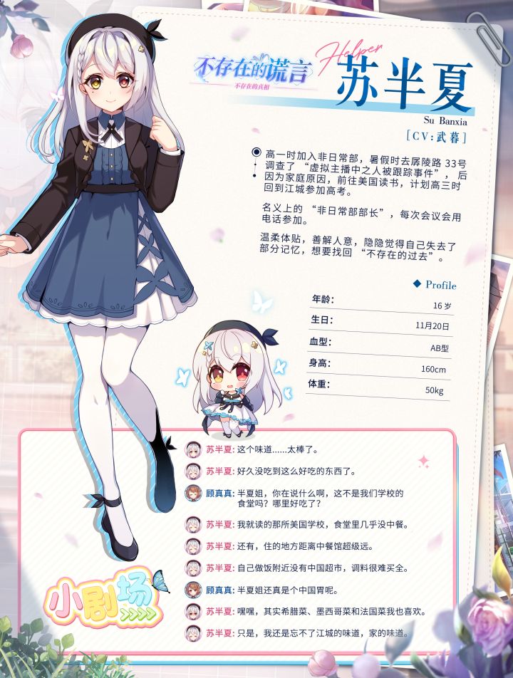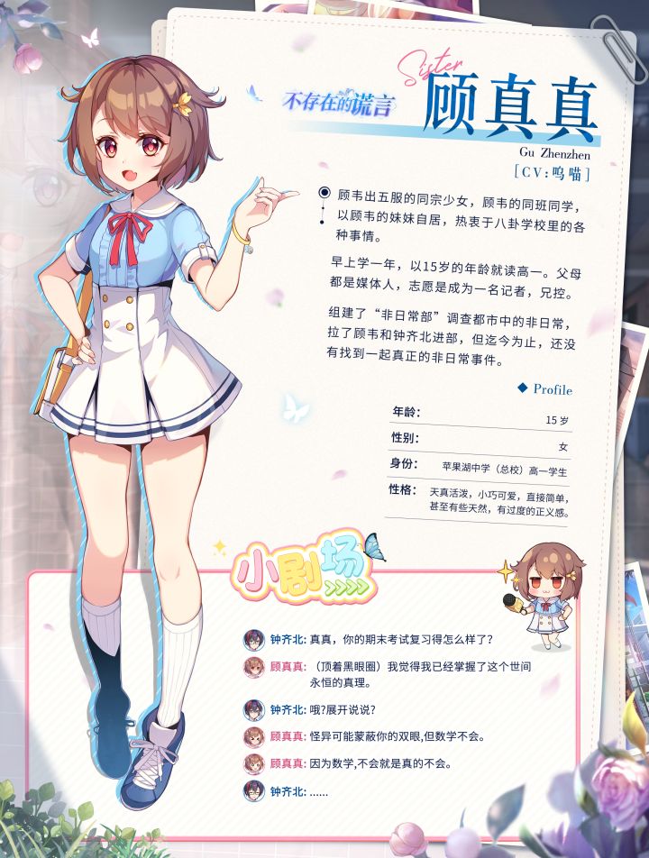 呀呼~欢迎大家回到小瞳的直播间!今天要向大家介绍的这位伙伴,也和小瞳有着不解之缘。如果没有她对怪异事件的刨根问底,故事就无法展开了呢。总之,就是这样一位非常重要的角色——甚至还有以她为核心展开的后续剧情!!非日常部的活跃可以说与顾真真部长的努力密不可分!而作为顾韦的“妹妹”,真真也为他和半夏贡献了有力助攻。那么对于这样一位活泼可爱的少女,大家有怎样的印象呢?来评论区告诉小瞳吧~(剧