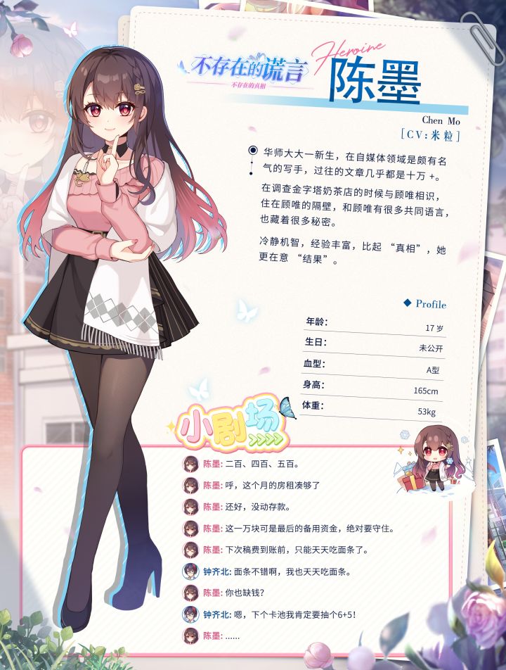 呀呼~欢迎大家回到小瞳的直播间!锵锵!今天要向大家介绍的是新篇章的新角色呢!也是本次的另一位女主角,陈墨。冷静机智,经验丰富,藏着很多秘密的“姐姐系”角色。和真真截然不同,但她似乎与真真之间有着有一些禁忌的秘密呢......?那具体是什么秘密,就交给大家自己发现咯~对于“大姐姐”陈墨,大家有怎样的印象呢?来评论区告诉小瞳吧~(剧透是绝对禁止的哦!)官方交(guan)流(shui)1群: