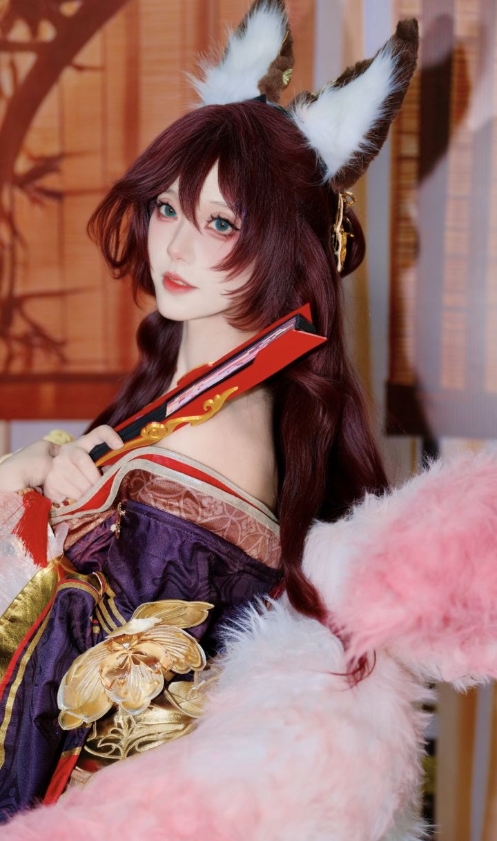 uid:100512025你完美诠释了妲己的妖冶与华贵,酒红色长发如瀑,狐耳灵动逼真,瞬间将角色的魅惑感拉满。服饰细节惊艳,紫底金纹尽显奢华,牡丹纹样与毛绒装饰,完美还原角色的狐妖身份与贵妃气场,每一处刺绣都精致考究。手持折扇的姿态慵懒又贵气,坐姿优雅,将妲己的妩媚与霸气完美融合,仿佛千年狐妖穿越时空而来。妆容精致绝伦,眼妆放大了角色的魅惑感,唇色明艳,将妲己的妖媚与灵动展现得入木三分。背景的古