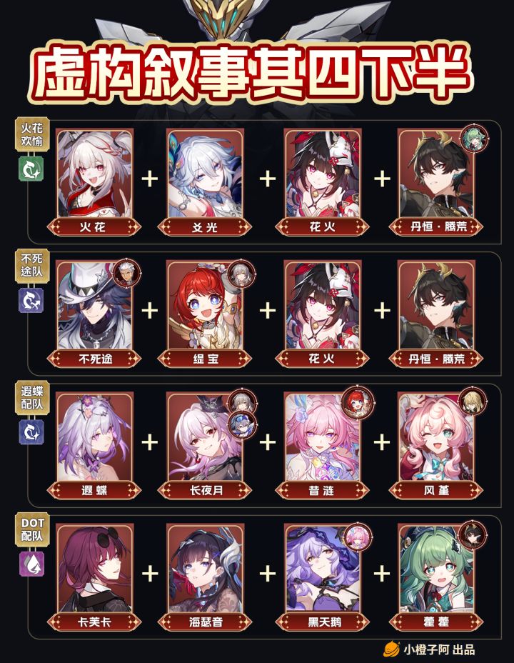 UID:104802274大家好哇,这里是小橙子阿。这一期橙子带来了新虚构叙事的配队推荐~PS:角色右上角圆圈的里的角色是可以替换的角色,小伙伴可以根据自身BOX进行替换即可。其次橙子的配队没有考虑凹分的情况,既没有推荐舍弃生存位选择辅助的配队,如果有需要凹满分的小伙伴可选择去掉配队的生存位对应加入一个合适的辅助即可。#崩坏星穹铁道 #崩坏星穹铁道攻略 #星穹铁道攻略 #星穹铁道献给破晓