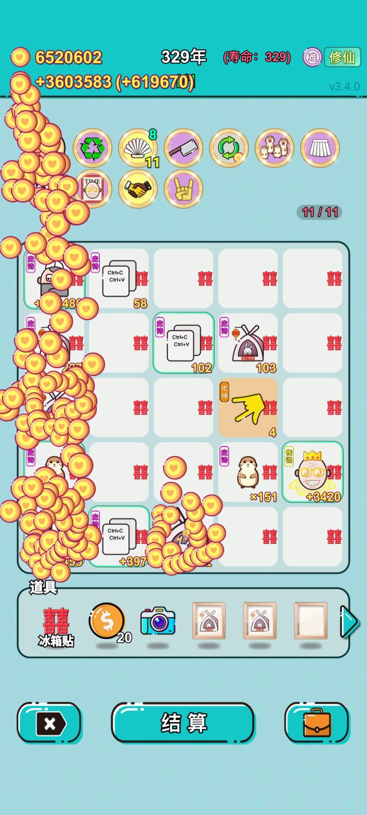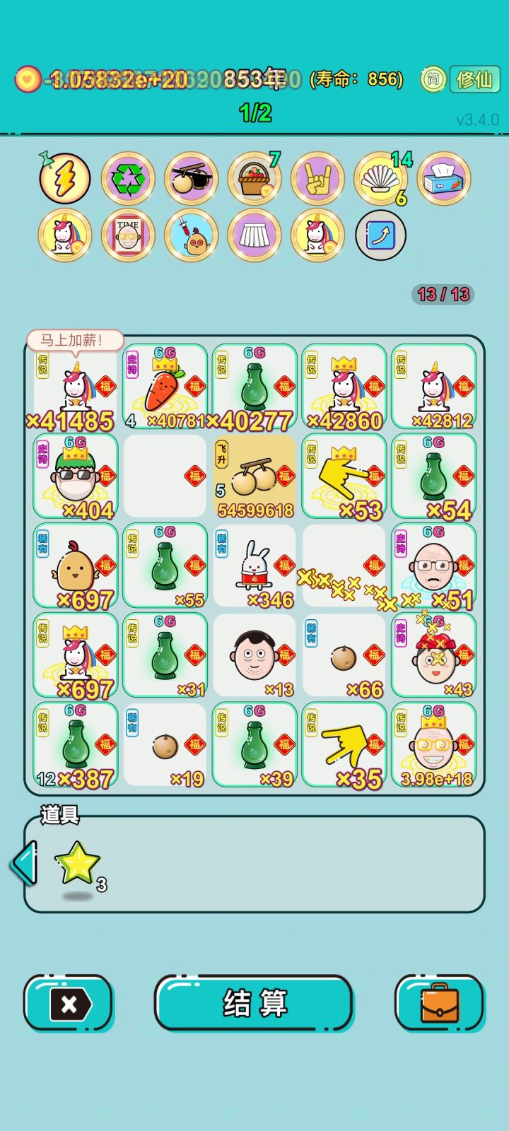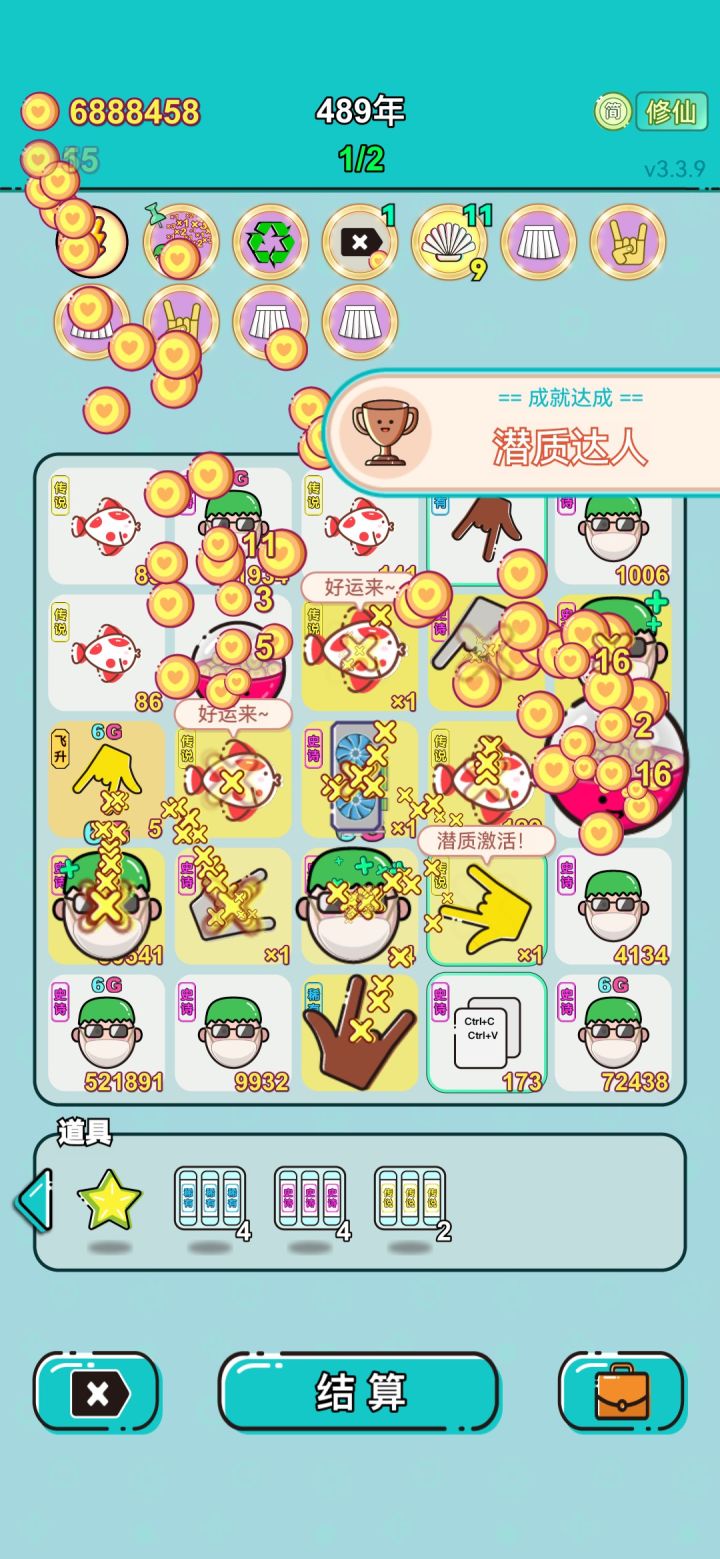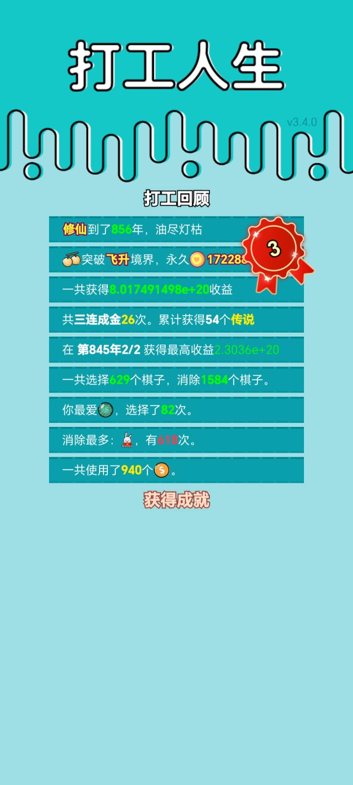 我打工坚持了856年。获得了第3名。共获得8.017491498e+20收益。累计获得54个传说棋子。共选择629个棋子,消除1584个棋子。我最爱筑基丹,选择了82次。好好玩啊#单机游戏 #游戏推荐