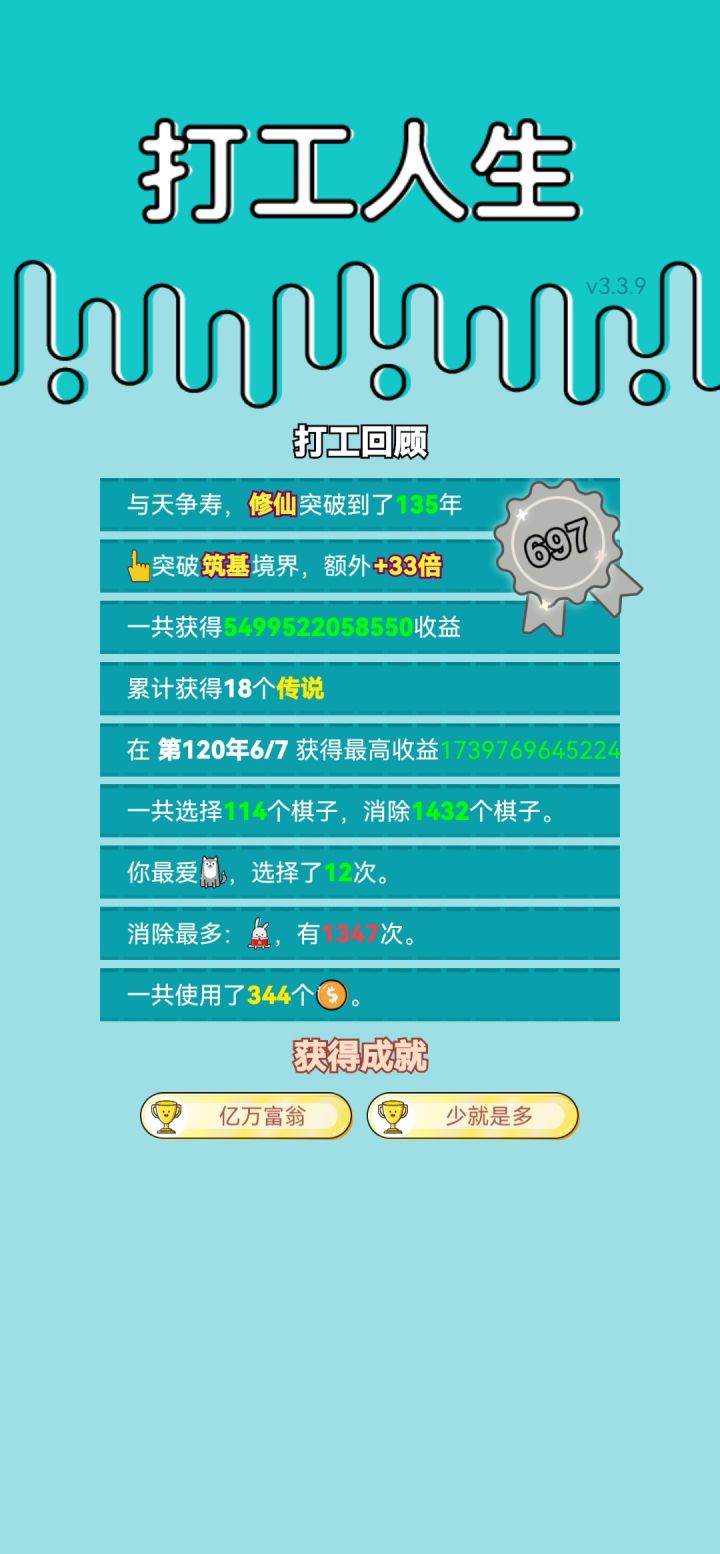 #单机游戏 #游戏推荐 我打工坚持了135年。获得第697名!共获得4859526151945收益。累计获得18个传说棋子。共选择114个棋子,消除1432个棋子。获得了2个成就!