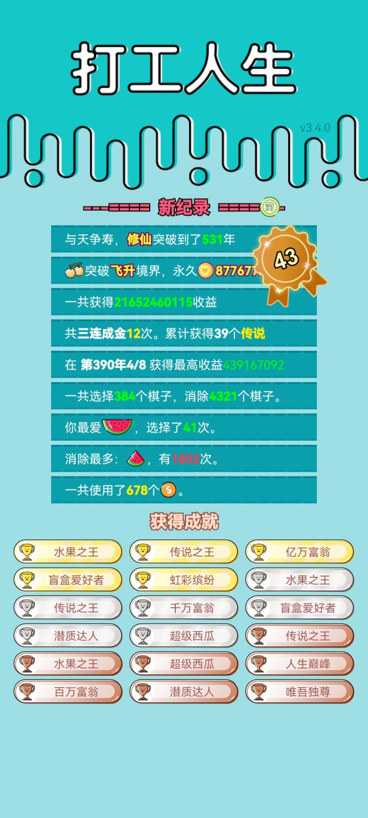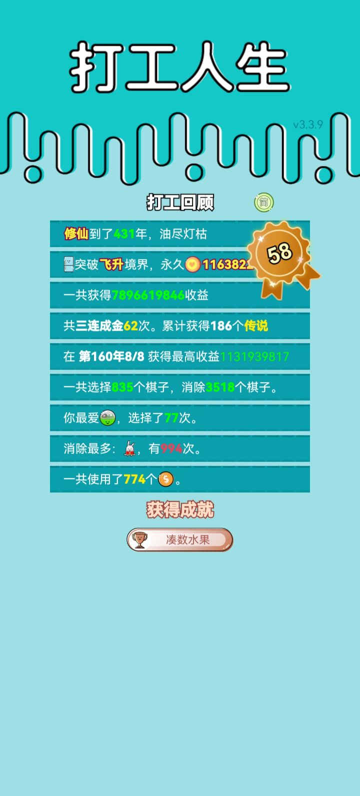 #单机游戏 #游戏推荐 我打工坚持了611年。获得了第88名。共获得907356747057收益。累计获得12472个传说棋子。共选择549个棋子,消除8718个棋子。我最爱鬼故事,选择了40次。获得了1个成就!