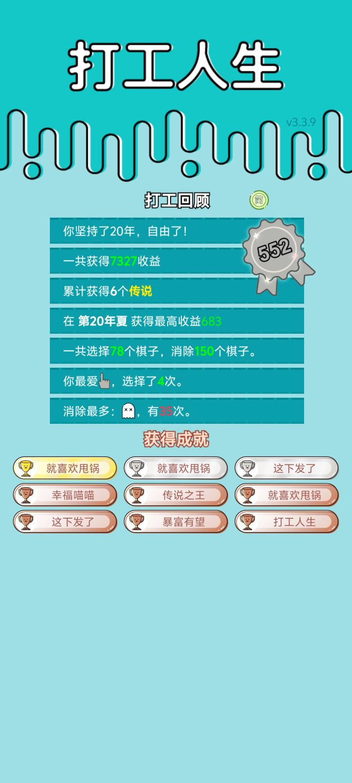 我打工坚持了20年。获得了第552名。共获得7327收益。累计获得6个传说棋子。共选择78个棋子,消除150个棋子。获得了9个成就!#单机游戏 #游戏推荐