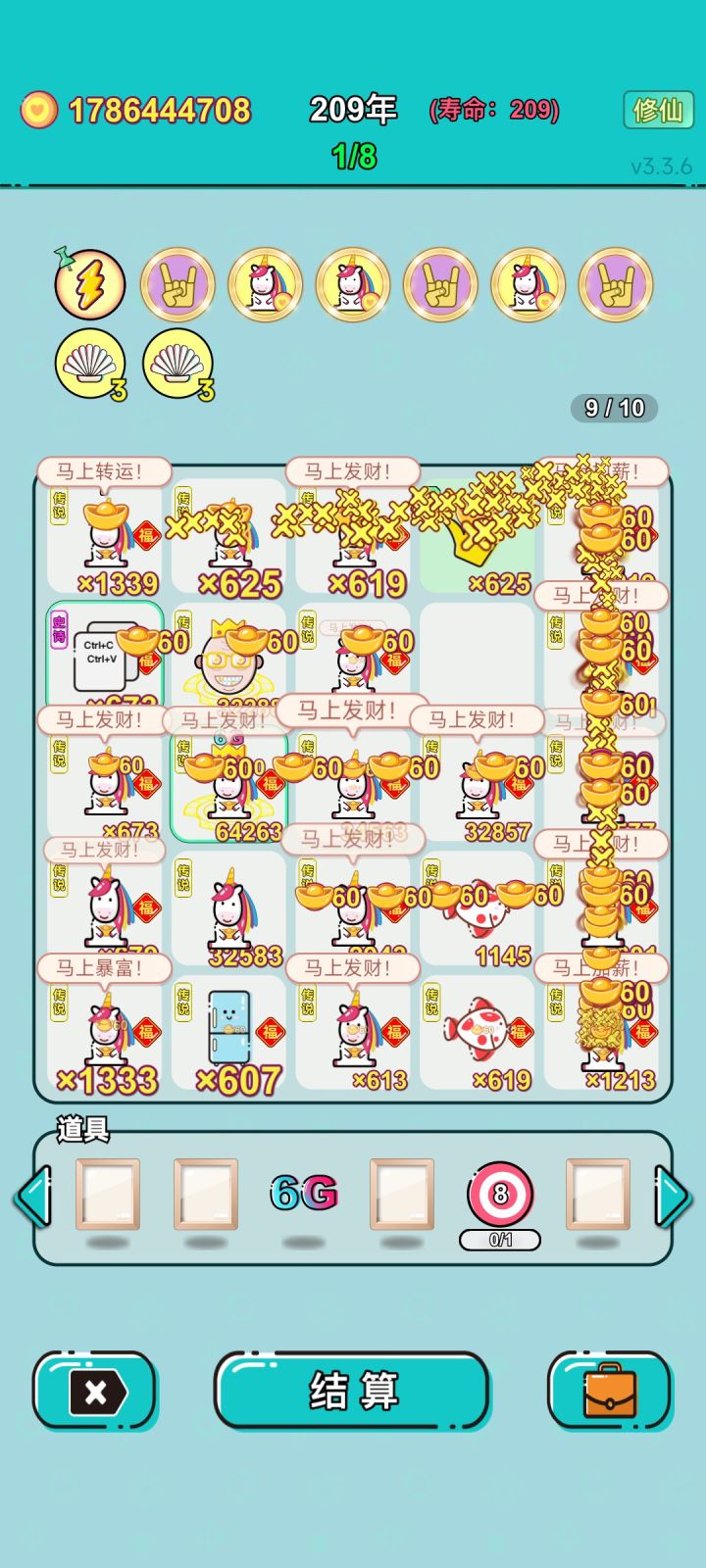 (准备条件)25福,准备五六个门框,框个首富,定制买五个强化福,一个金合成,一个潜质兔子,一个复制器(注意不是复制书)(使用顺序)填满25个福,再清空场上物品只放潜质兔子,把复制器放进去,结算几年复制到10个的时候把兔子卖了,再放首富