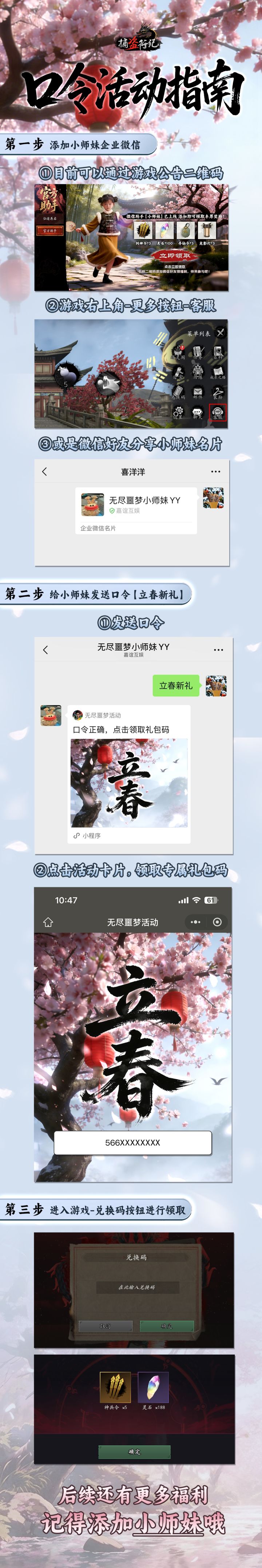 立春口令活动来啦~快来添加官方企微参与互动吧!注:怨灵咒兑换功能已停用,故本活动仅支持捕盗行纪账号参与~《无尽噩梦7幻梦》预约已开启:#中式恐怖 #捕盗行纪 #无尽噩梦 #无尽噩梦5怨灵咒 #捕盗行纪 #无尽噩梦7 #无尽噩梦7幻梦 #游戏福利