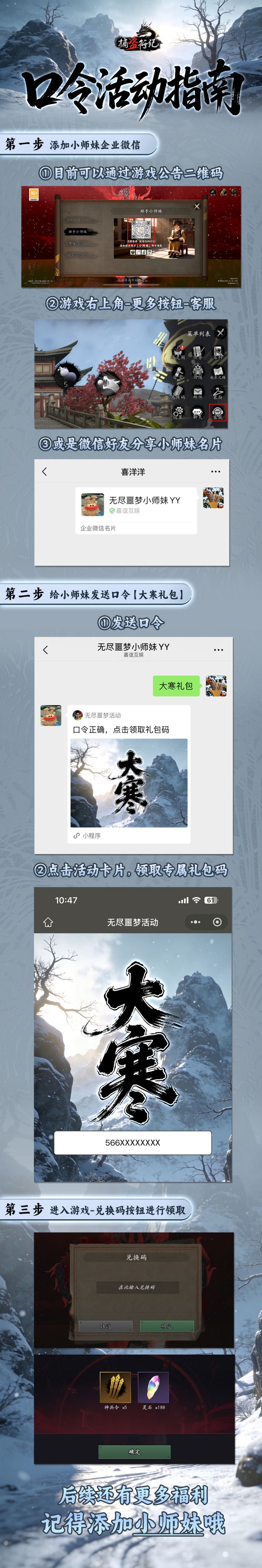大寒口令活动来啦~快来添加官方企微参与互动吧!注:怨灵咒兑换功能已停用,故本活动仅支持捕盗行纪账号参与~《无尽噩梦7幻梦》预约已开启:#中式恐怖 #捕盗行纪 #无尽噩梦 #无尽噩梦5怨灵咒 #无尽噩梦7 #无尽噩梦7幻梦 #游戏福利