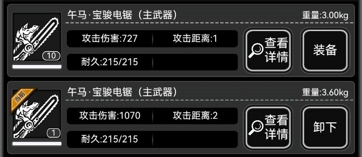 首先是高碳电锯无头电锯电锯和横扫熟练度在六级情况下,横扫消耗对比。首先是高碳电锯无头电锯维修消耗。攻击范围相比正常电锯少了一格在4sg、满战、电锯6级和通电横扫6级情况下,活动高碳电锯能砍124刀左右,无头电锯能砍233刀左右但只有一格攻击范围。