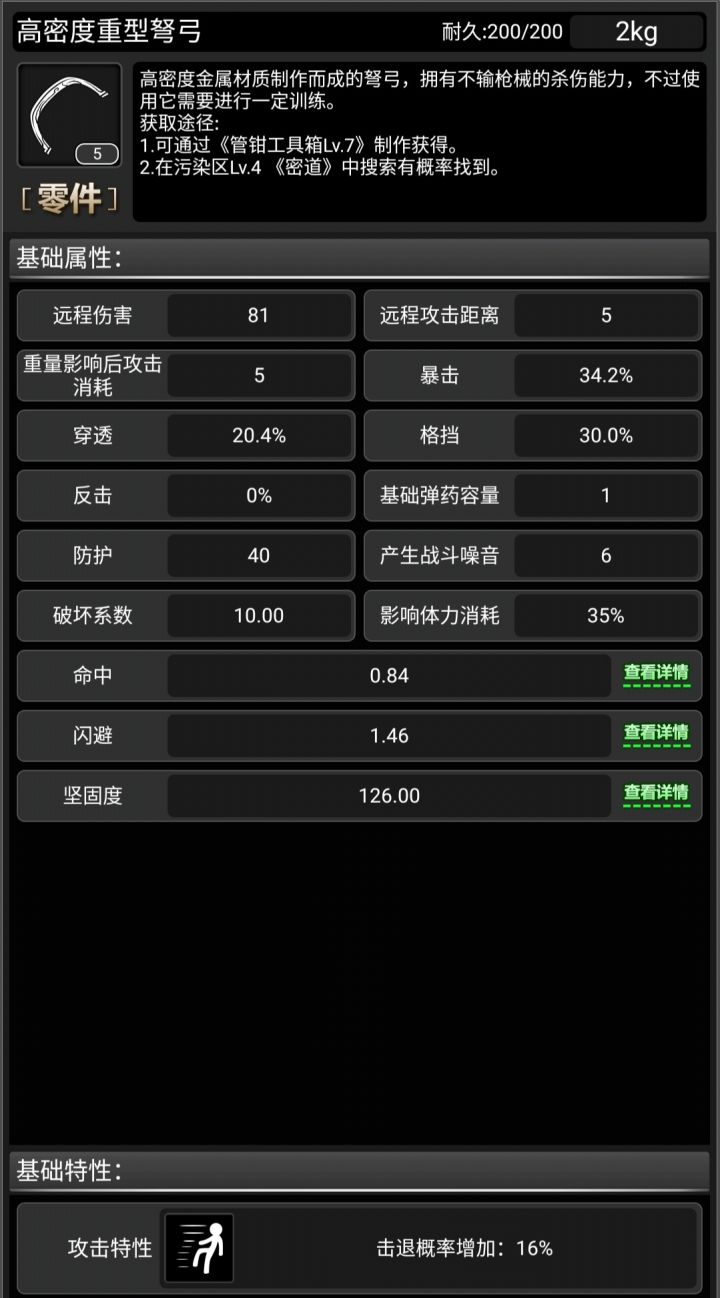 重型手弩熟练度加成(现版本所有熟练度满级皆为7级):每级加成:近战伤害+15;远程伤害+15;近战攻击消耗-1%;远程攻击消耗-1%;命中+0.02;穿透+0.01;姿态体力消耗-1%满级加成:近战伤害+105;远程伤害+105;近战攻击消耗-7%;远程攻击消耗-7%;命中+0.14;穿透+0.07;姿态体力消耗-7%重型手弩大分类为:弓弩类—制式弩组成:弩弓+弩臂+弩机弩弓可装卸:高