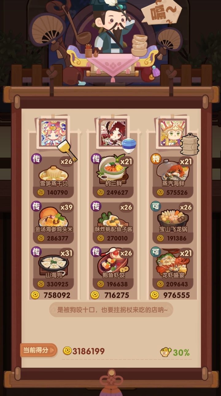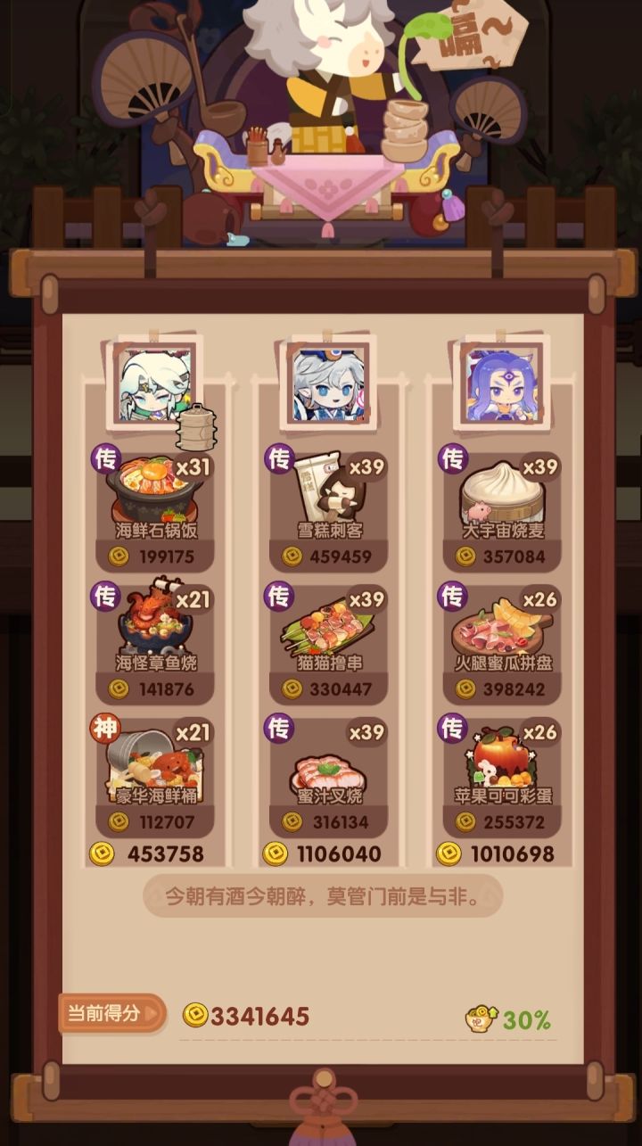 图鉴也有宴会跑分啦,目前功能测试中,算分不稳定,后续会逐步改进跑分注意事项:①跑分只是轮椅功能,目前不保证跑出最高分,分数只作为参考,分数不达标可手动调整厨具菜谱②手机跑分后可能会出现无法更换厨具、厨师、菜谱的情况,出现此情况可在菜单点击保存,保存该方案,然后刷新页面后读取方案进行调整,后续会修复该问题③目前小鸟胃贵客跑分较慢,耐心等待即可,后续会优化低饱食度跑分策略④手机性能低会影响跑