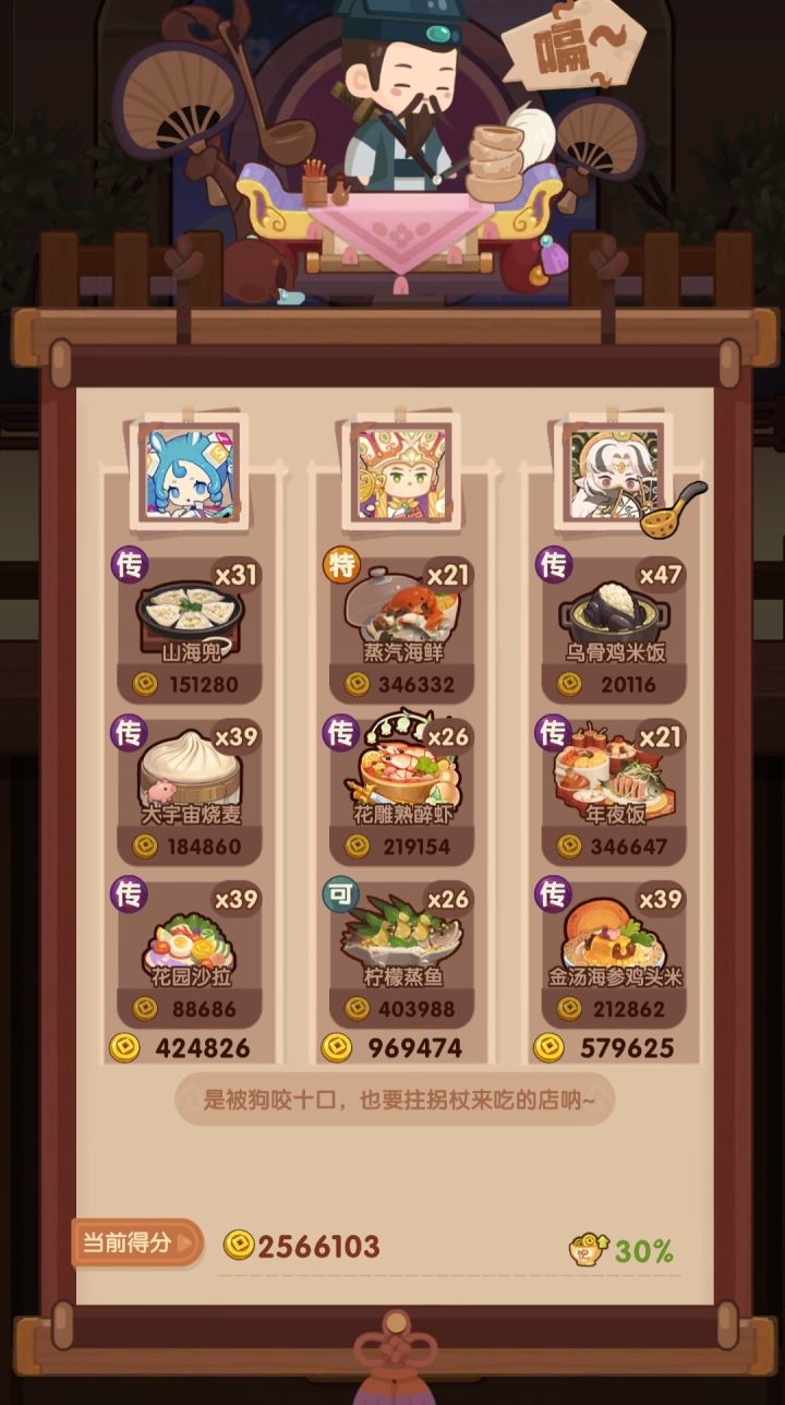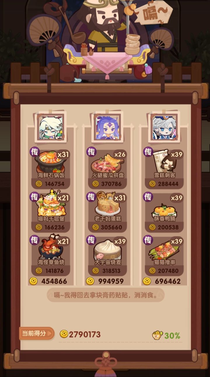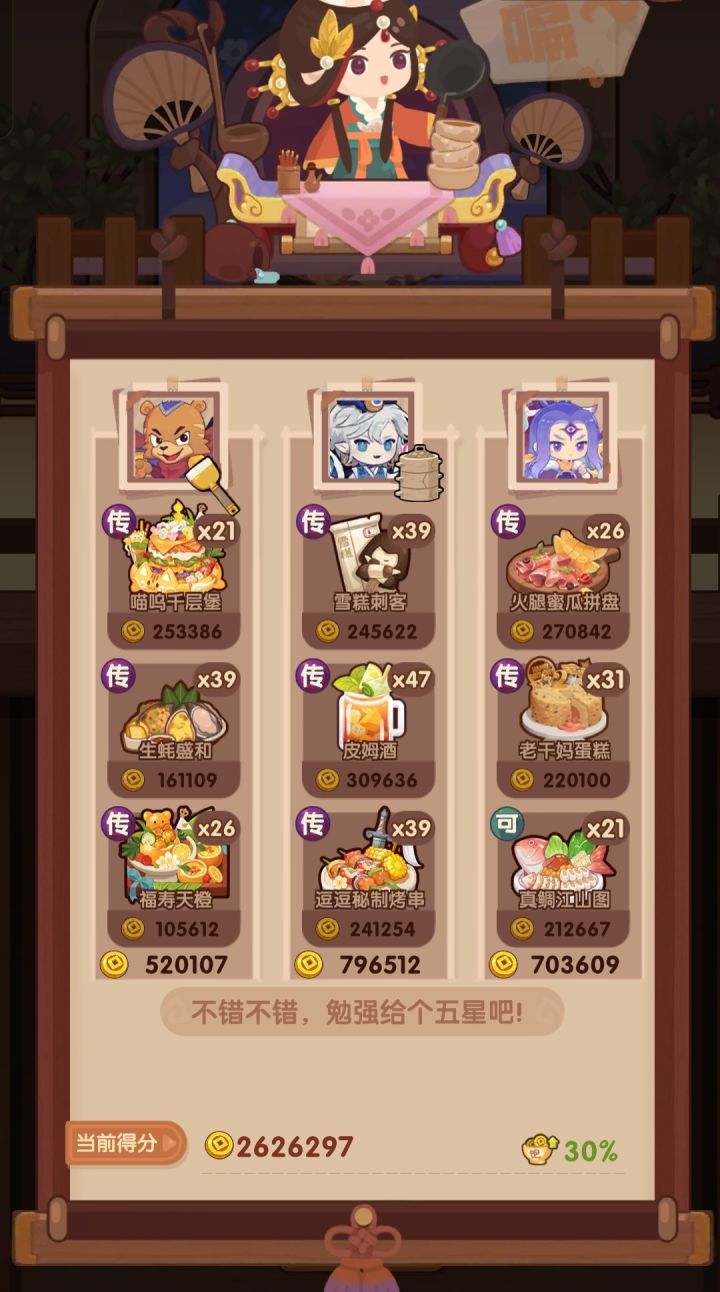 🧱前排提醒 (省五档分数线:1980000)本次双贵客均能实现满档,何仙姑注意【山海兜】必须神品级,任何非烤神菜均能替换。舒婷菜不重要,炒即可,基修不够可以换菜。 📌菜谱优化 生蚝盛和 下位🔥罐罐牛肉/莓果慕斯/孟婆汤 巧克力蛋糕 下位🔥年味拼盘(包括上面3个) 火腿蜜瓜 下位🔥[传]苹果可可/福寿天橙 若用福寿天橙,与宇宙烧麦换位置,分更高 蛋包饭定食 下位🔥蟹味鱼糕/黄金分割烧麦
