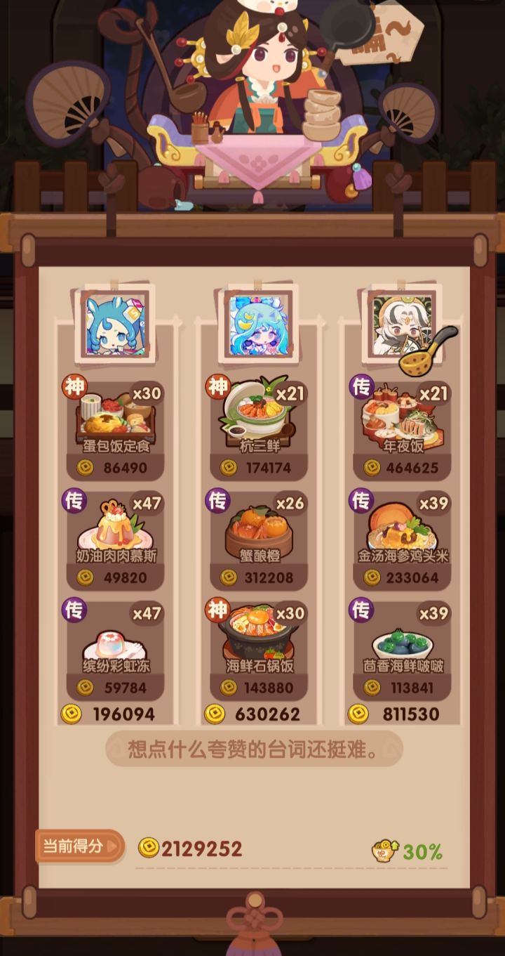 🧱前排提醒 ——满档分数线3040000 本期提供双单通方案【P1+2】,省食材方案暂不更新,沿用上期链接即可。🌷【特图图】推荐加漏勺做【传】年夜饭,前两道尽量保证【神】,但不能【传】,菜无所谓。 🌵P1-2菜谱优化 生蚝盛和 下位🔥南瓜烤肉/莓果慕斯雪 龙虾盛宴 下位🔥海怪章鱼烧/蒸汽海鲜香烤百花卷 下位🔥茴香海鲜啵啵/紫气东来火腿蜜瓜盘 下位🔥苹果可可彩蛋/打冷鱼 🎃上期链接【