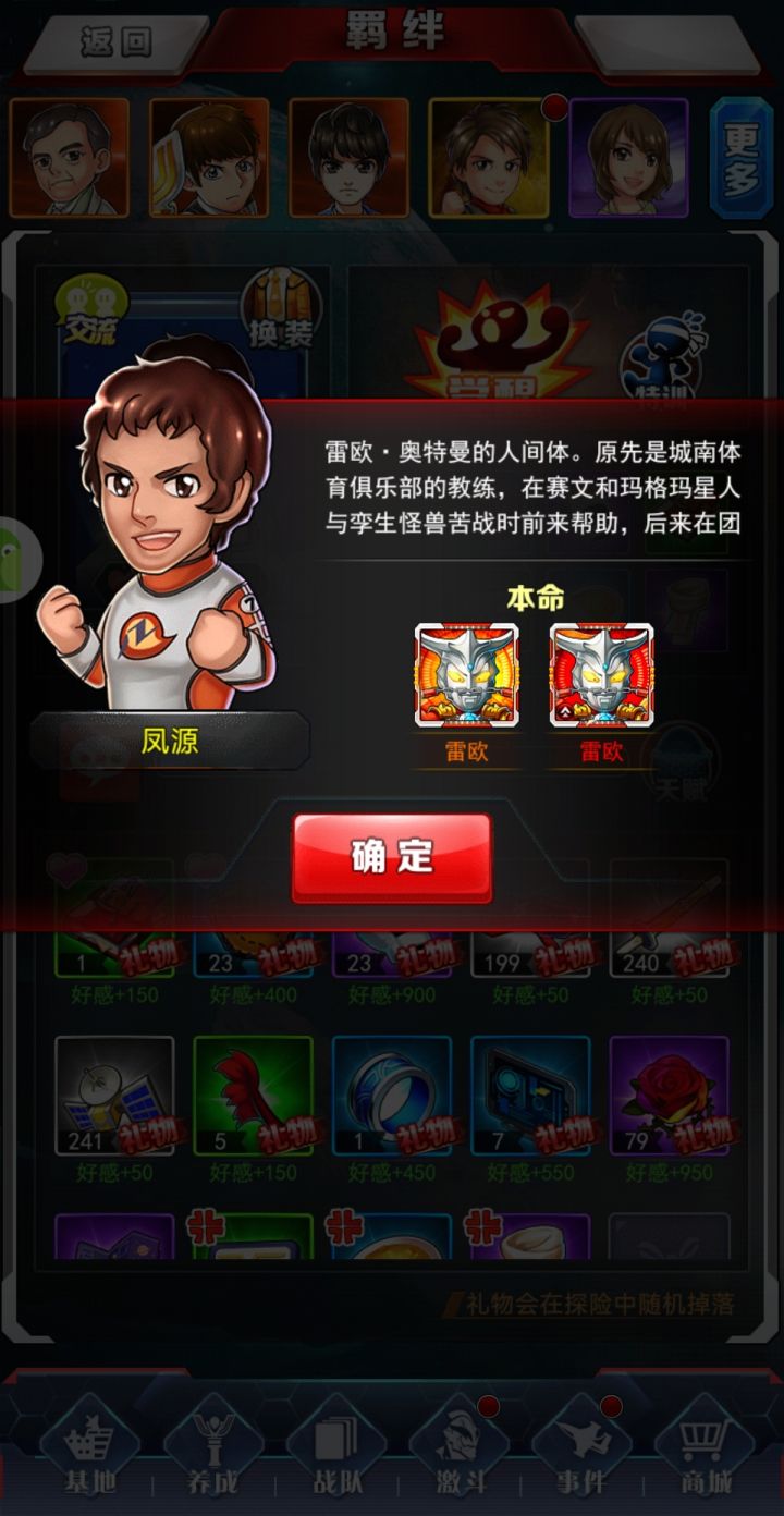 凤源-雷欧奥特曼的人间体 喜欢的礼物:战斗日记、棒球手套、格斗手套讨厌的礼物:飞行执照、咖喱饭、白色围巾 特训需要的羁绊:诸星团、绿源川子、日比野未来、布莱克指令、大河望