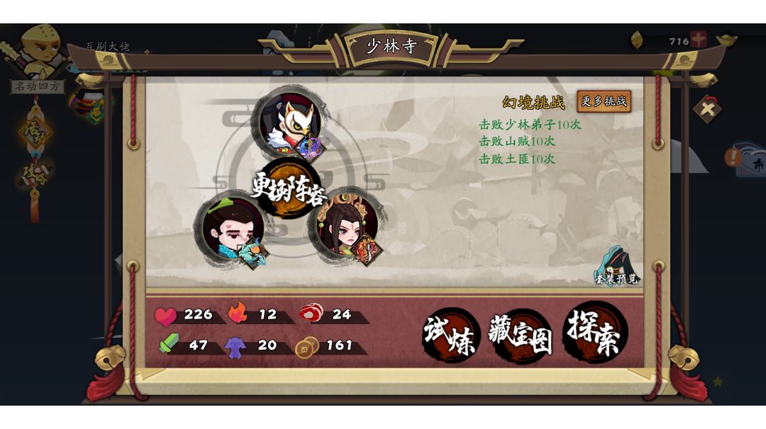 发现游侠进化终结流打幻境贼快,阵容如下武侠:长春首徒,流云紫化形;古墓掌门,不需化形;第三人神雕不可不戒均可,雨林补伤害,少林大漠回血。武学需要全真心法和冷月窥人暗武学。进图即可秒人,刷图快不需key卡,可拿万剑逍遥省手回血但怕无敌怪。