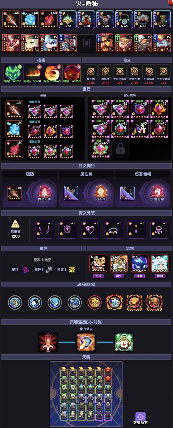 各位亲爱的游侠玩家早上好 中午好 下午好 晚上好 今天给大家带来火游对群搭配【一图流】 【目录】 一、【秘境介绍】 二、【装备】 三、【武器】 四、【魂卡】 五、【天赋】 六、【咒文】 七、【宠物】 八、【技能】 九、【魂系】 十、【魂树】 十一、【星盘】 十二、【外装】 十三、【炼金】 十四、【小屋buff】 十五、【宝石】 一、【秘境介绍】 护甲:9800