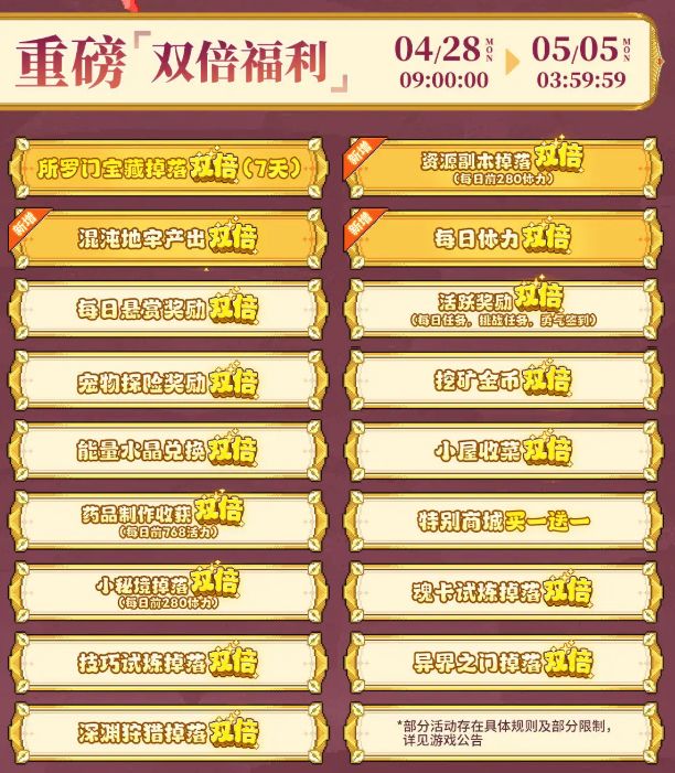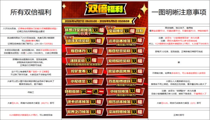 2026.4.20大家好,我是不成诗。本帖带来勇者节双倍福利的一些说明。简便一图:更详细的说明:本次勇者节双倍福利,大部分内容是不需要玩家提前存什么东西的。但是为了追求极致收益,我们还是可以做一些工作:(2026年4月26日需要做到的事情,新玩家指4.27新服玩家)1.魂卡试炼(60/75)老玩家:前面留4天不打;新玩家:正常三星通关解锁难度,收益高于老玩家存次数。2.技巧试炼
