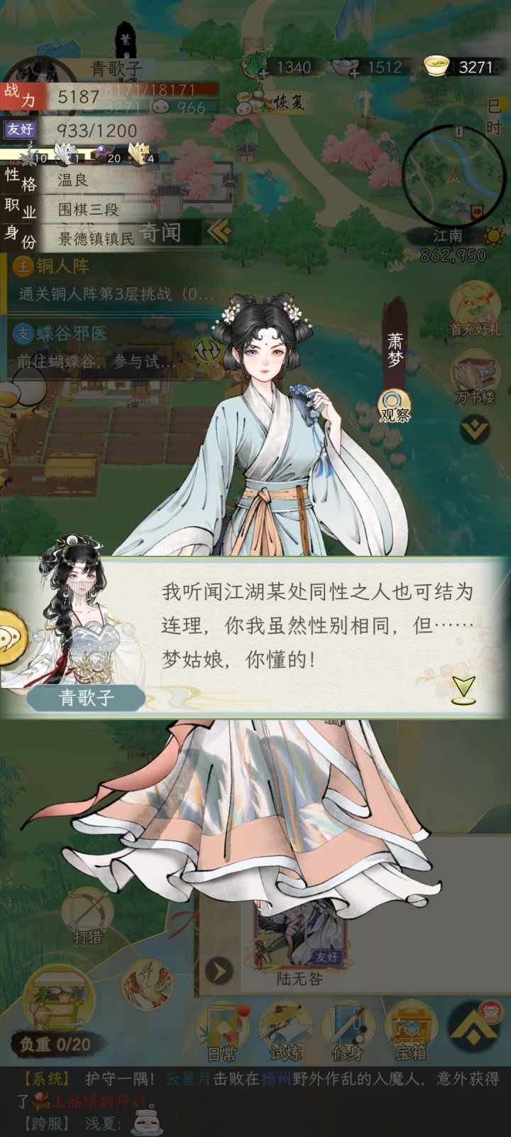 在家闲来无事,忽见一貌美女子背着木头和我打招呼并表达对我姑苏第七剑客的景仰之情,遂翻列表,发现有一NPC男友,大喜,心动不如行动,当机立断,挥手送出我的一生一世花,刷至至交遂表白,女子踌躇陷入犹豫,该女子男友遂来找我solo,败,吾遂得列表第一位女友。话说他男友打我一下真痛啊靠,随便劈一下劈我1/3的血量,还好最后挡了几次,落英剑给我回了下血量,险胜险胜。#华夏千秋 #游戏日常 #我在华夏千秋