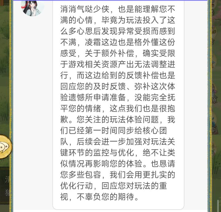 道歉还算诚恳,怒气平复了点儿。补偿6666+1藏宝图打发叫花子,然后没法额外补偿了(我提议补偿所有受损的玩家30论剑函,这个真不多,又不是300论剑函),但是诚恳的道歉+保证,勉强能接受。这游戏本来是可以成为现象级的,被急功近利的运营策略和数值设计玩崩了,只能说可惜。