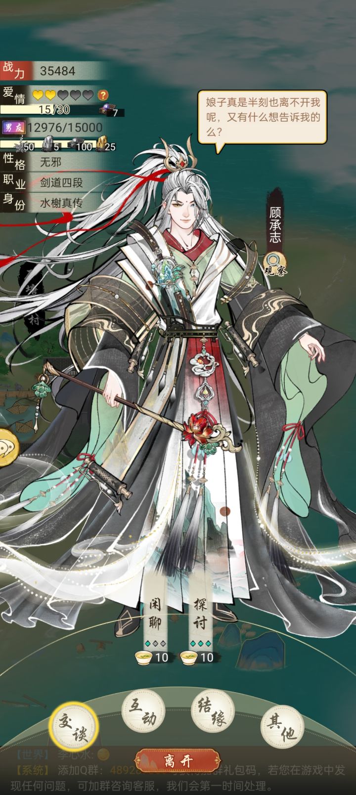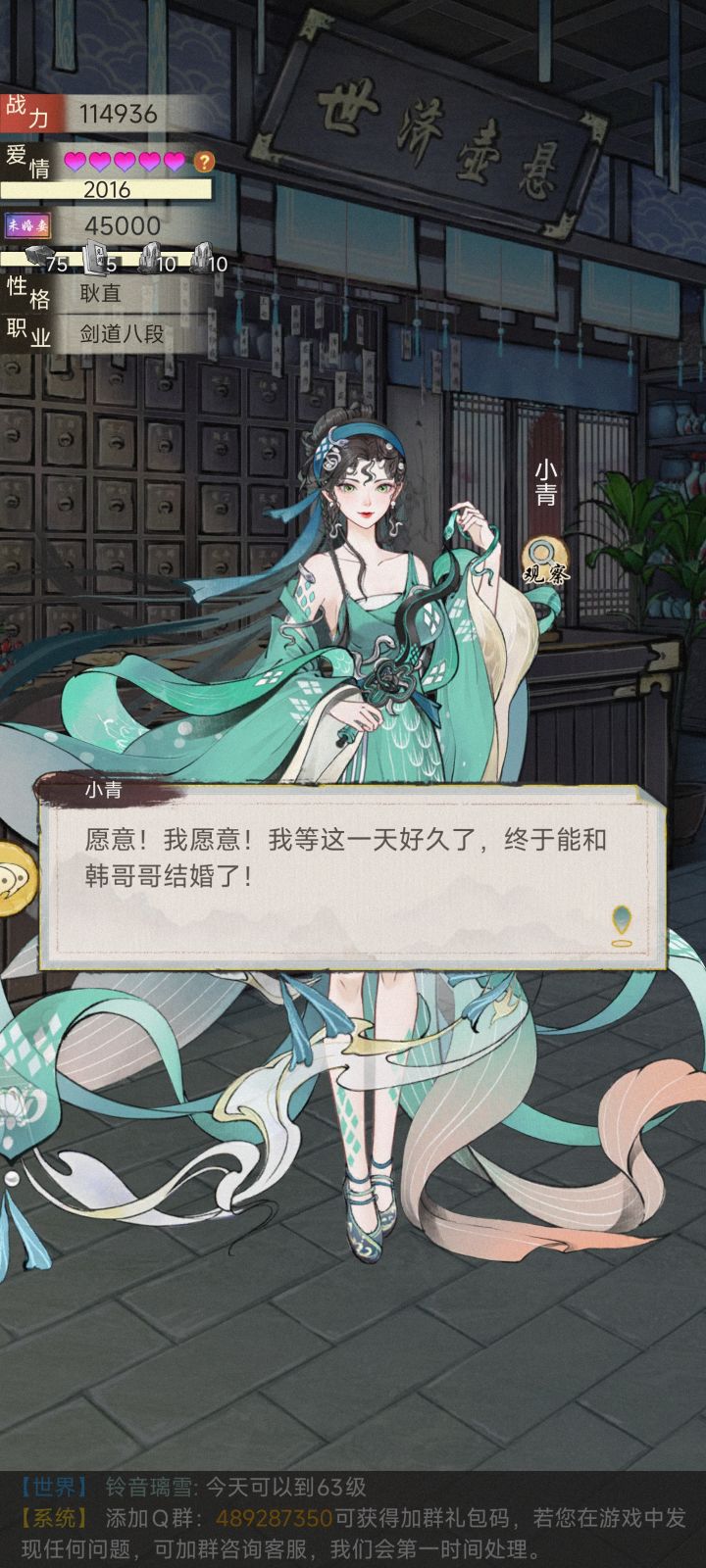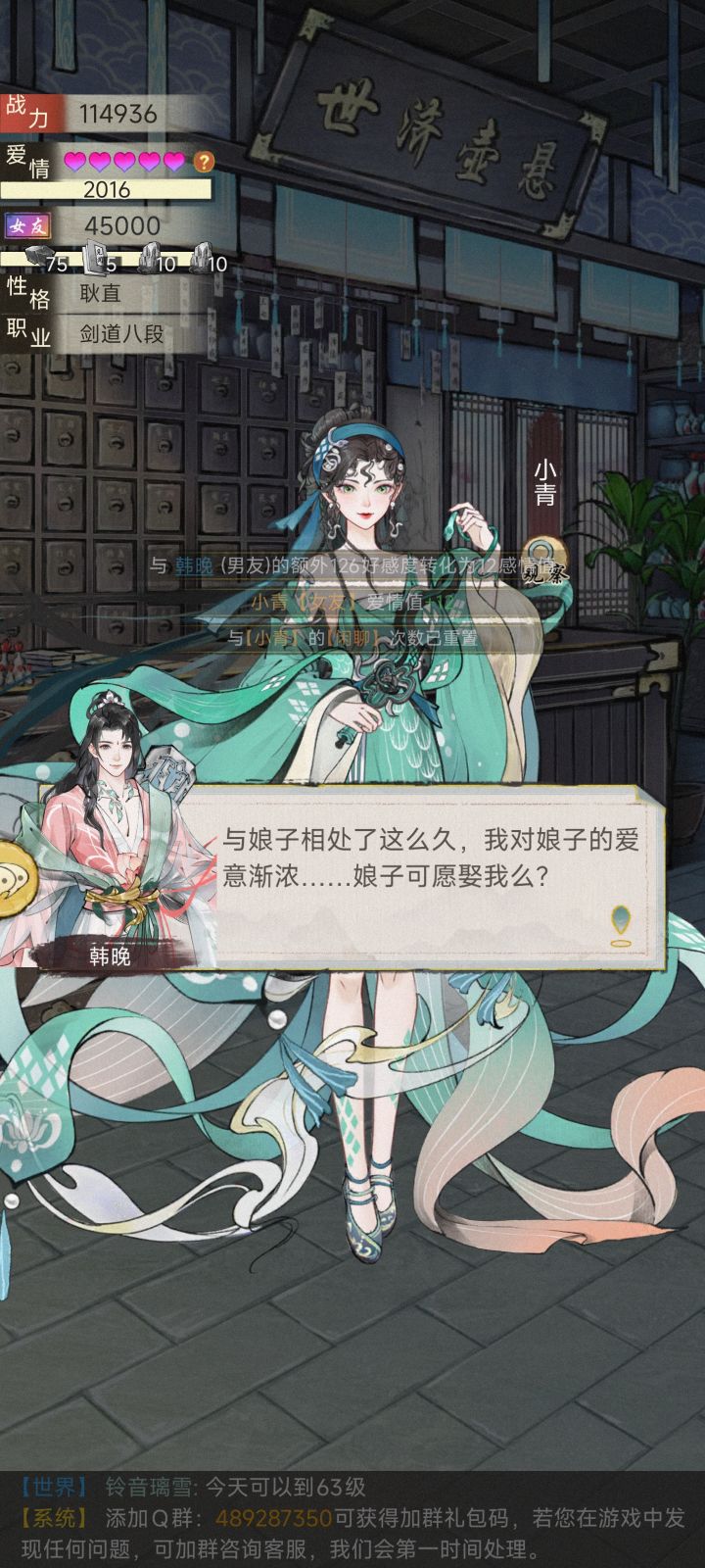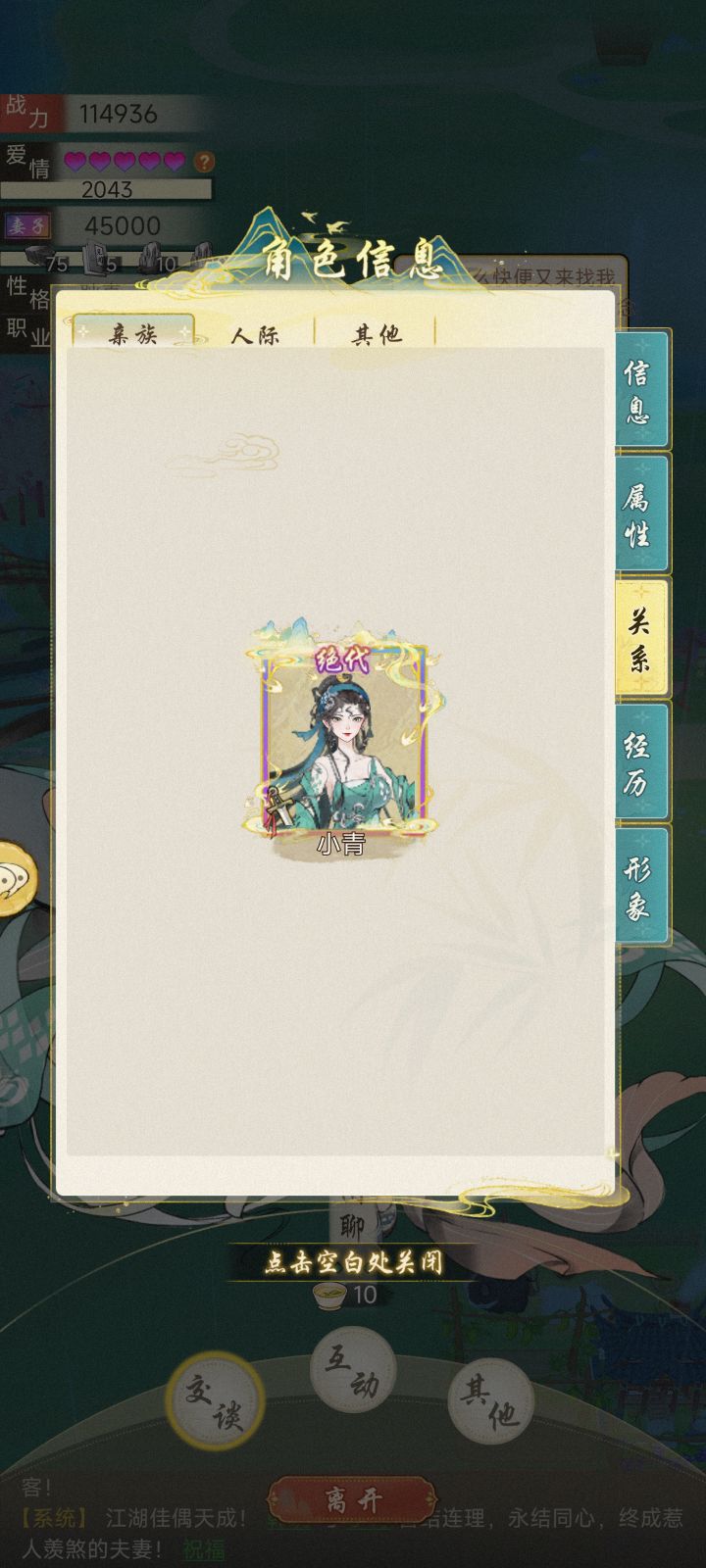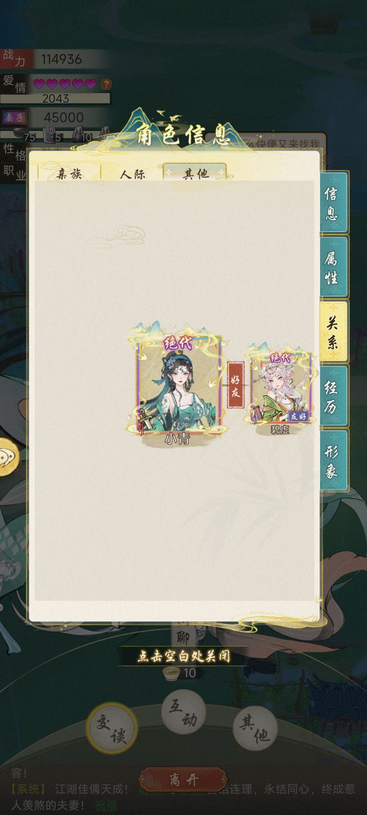 本测基本所有时间都在刷小青好感,不负时光,终于将她迎娶回家。然后有两个问题1.为什么只有我有婚服,小青的婚服哪儿去了?(下线,再登录,又出现了)2.如图,我从小青的关系里面消失了,就好像我从没来过,完全没有显示。这两个问题应该算是绝代NPC的bug吧?