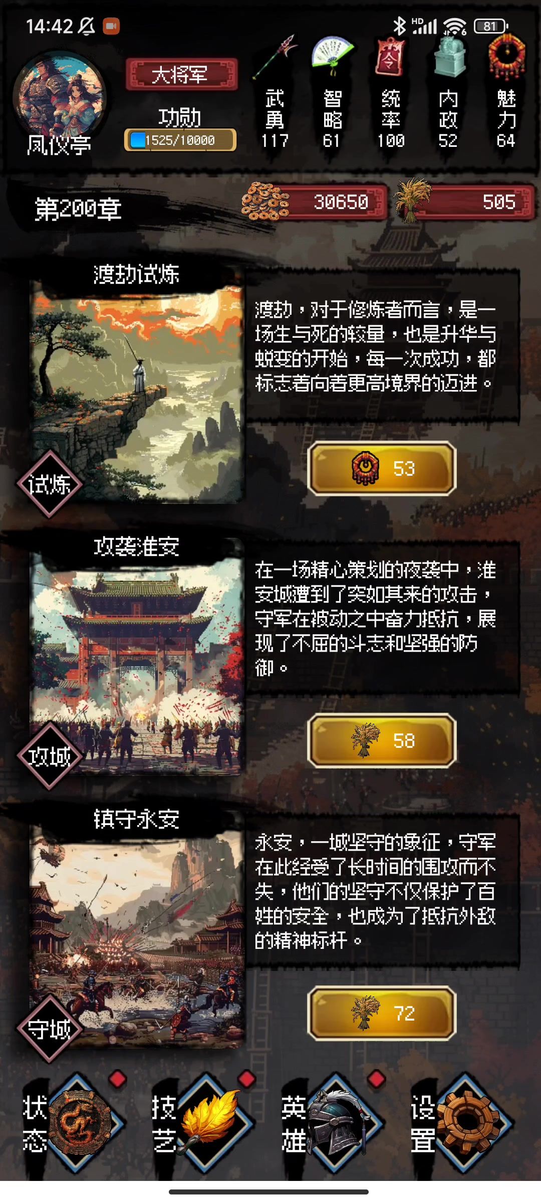 先叠个防护甲,证明一下我还是有入门的。总的来讲,作为一款肉鸽游戏,通过主线打出各种结局才是我们的目的。对于这游戏来讲,目前一共有【吕布传】、【郭嘉传】、【赵云传】(付费),三个传记。每个传记的成就都能领取各种道具。而想要打通结局,首先是要官职满20级,这个是硬需求,无论是什么结局,都必须要在20级的功勋下。其次是满足各个结局所需要的属性,这点论坛里有大佬已经给出相应的属性要求。这里先给