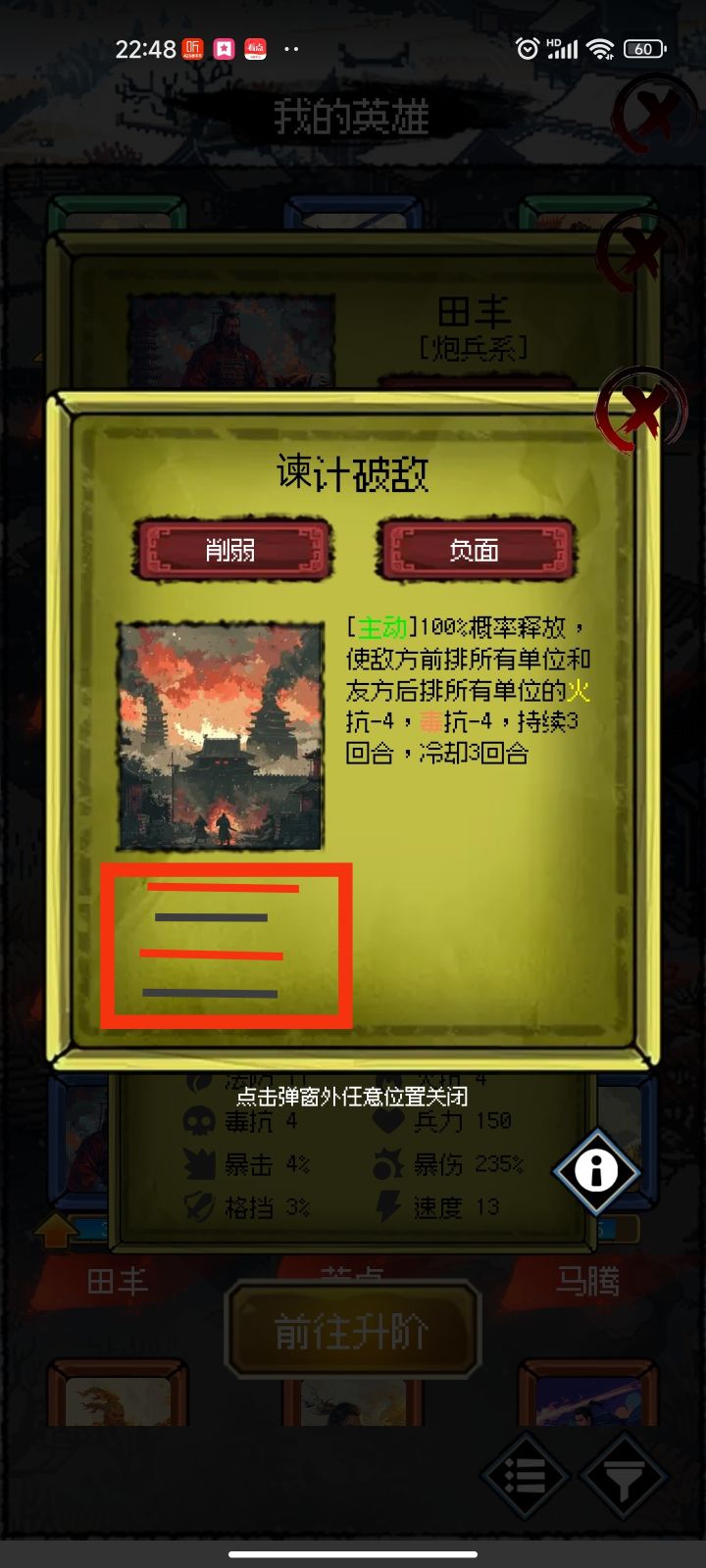 1.需要阵容储存,比如援救之后,右下角少一个就很尬。2.可以在技能图片下边加12个点,显示技能的具体范围,黑色是技能范围。3.可以出个斗阵系统。。。也算加点内容。4.特权卡到那个级别要花多少能不能提示一下。微氪党想氪到奖励翻倍不知道要花多少钱。5.加强一下兵种特色,比如根据上阵兵种消耗不同的粮草(骑兵一队消耗10粮草,步兵一队消耗6粮草),枪兵对骑兵伤害提高25%,之类的。。在头像边上加上