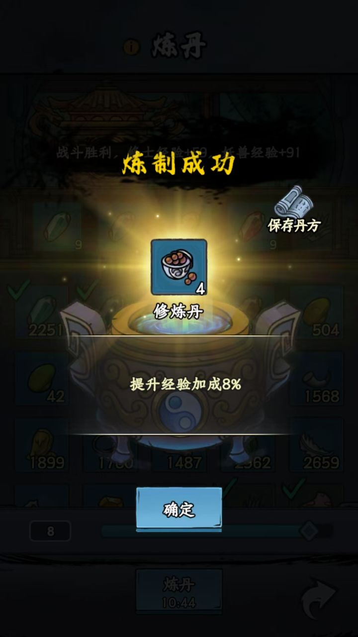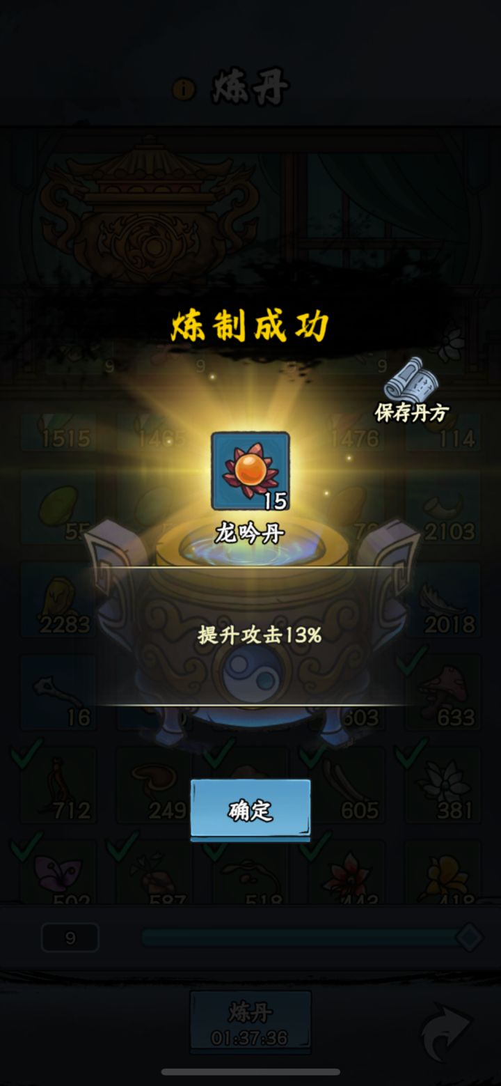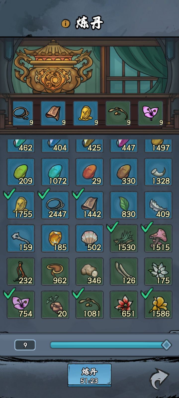 UID:20184570宗门合欢丹,图上材料各九个用于提升合欢宗血量,提高持续作战能力,不至于被轻松秒杀。