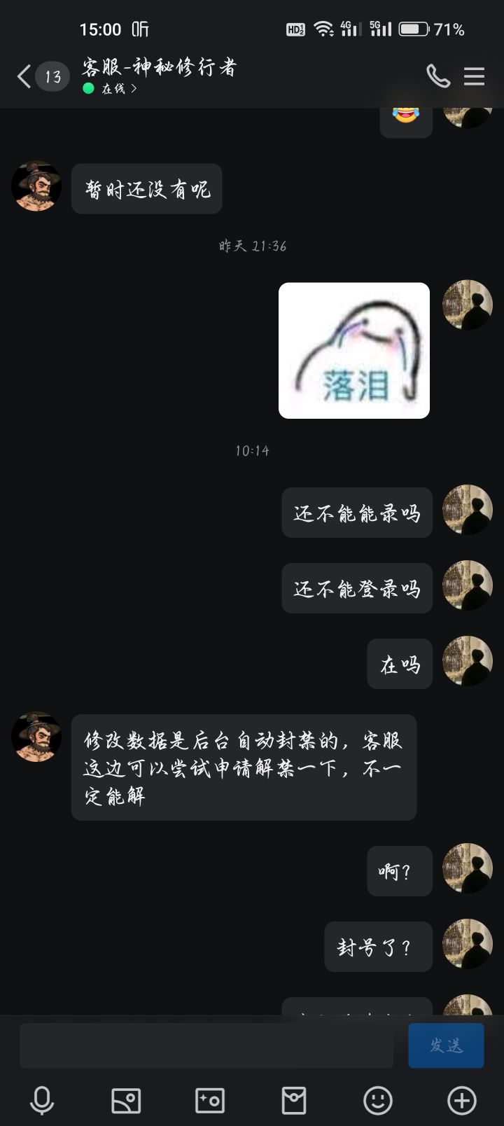 全DLC全月卡已经买了,如今显示我封号,如果官方不给我解释,我今天必须告诉大家,这个游戏就是摆烂了,充钱的单机都封号,尤其是更新了新版本才封的号,我就是个屑,我是大怨种,
