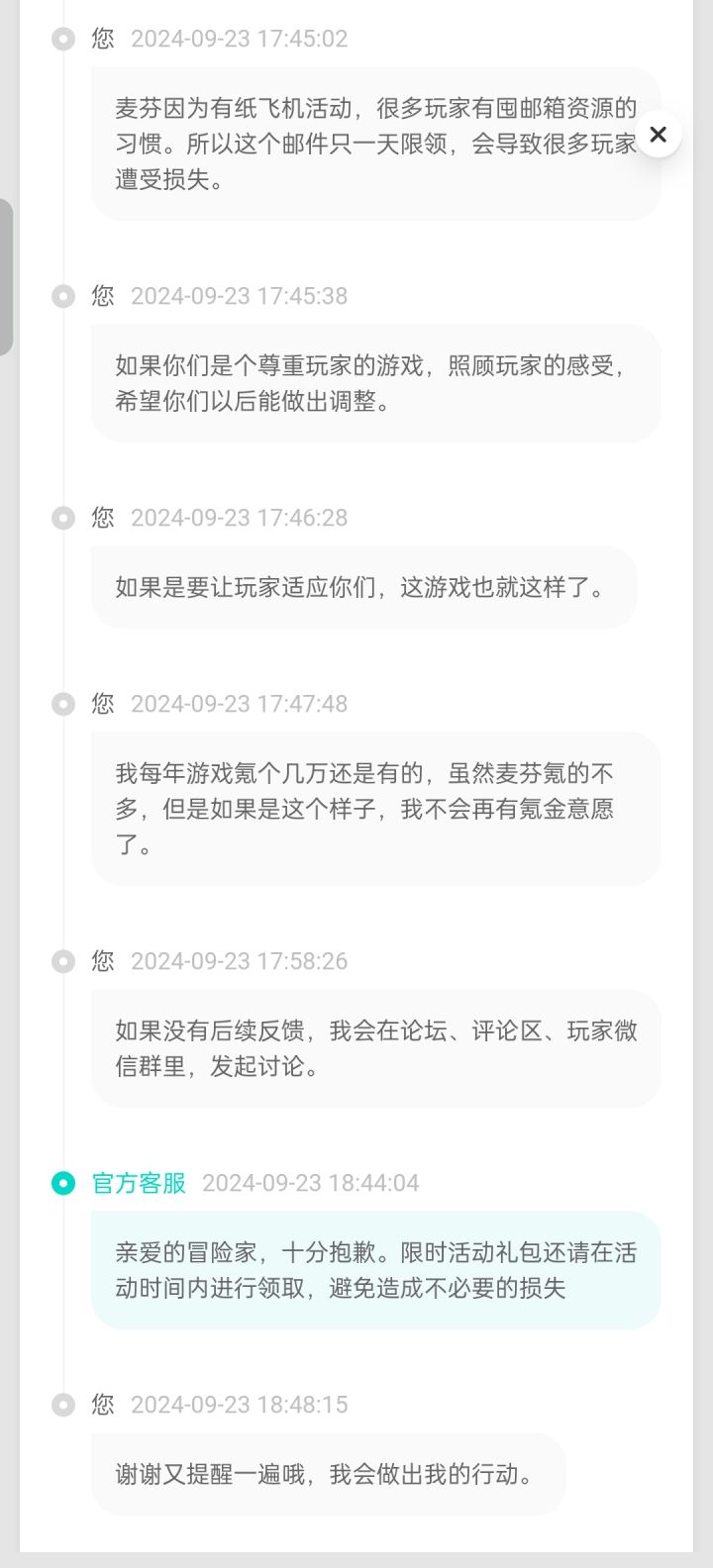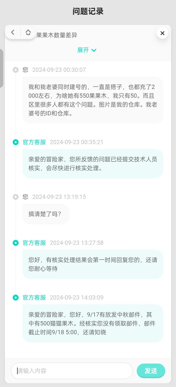 我是57区建了号,体验了一下觉得还不错,拉了老婆两个人,在58区开区蹲点建的号,组的搭子。氪度1700+,老婆的号1800+。昨天突然发现她的仓库比我多500个果果木,玩家群里也有很多这种情况,所以去问了客服,才有以下后续。因为麦芬有纸飞机的活动,所以开区很多玩家会听取攻略建议邮箱囤能源,等纸飞机活动开了,再领取邮件能源,获取更多的纸飞机积分。我也听取了攻略的建议,因为邮件很多,而且基本都是一