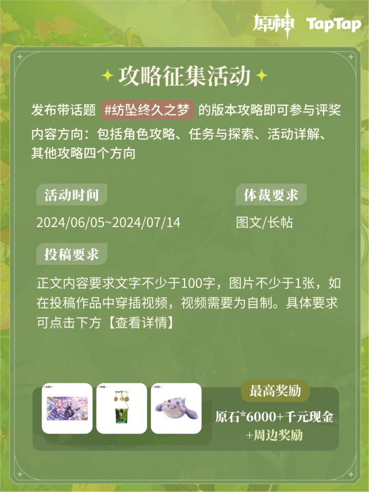 旅行者们~原神4.7版本#纺坠终久之梦 上线啦!新版本攻略征集活动、打卡活动和H5抽奖活动也于今天正式开启~活动一:H5抽奖活动活动时间:2024/06/05-2024/06/18抽奖点击: 或 点击文末banner进入活动页~即有机会抽取旅行者系列粘土人、先祖法蜕毛绒玩偶、648元现金等丰厚奖励活动二:版本打卡活动活动时间:2024/06/05-