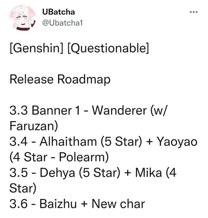 3.3 散兵 四星珐露珊3.4 艾尔海森 四星瑶瑶3.5 迪希亚. 四星米卡3.6 白术消息来源uba 粉球和数据解包3.4凌华和丽莎皮肤须弥新地图 沙虫新世界boss新的深渊敌人关于胡桃舅的情报是,如果胡桃不在3.3,需要在3.4版本的下半才能避开春节,那么意味着她的复刻时间会超400天最后给出的解释为一切皆有可能散兵头像以及侧脸插播一条散兵和珐露珊突破材料(细节可能会