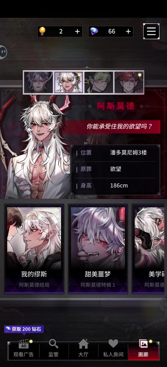看广告实在是太麻烦了,过了一个结局后没有耐心了,搜另外三个魔王的结局,发现还缺了个阿斯莫德,我来补上~ #地狱之吻 #地狱之吻阿斯莫德