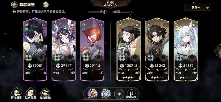 说明一下,我是一名小氪玩家,心得体会分享给新入坑玩家,走了不少弯路,值得一看,欢迎交流。1、阵容。抽卡游戏肯定离不开阵容的搭配,我玩的是极限孙悟空,队伍优先级依次是孙悟空>太平鸟>嫦娥>猪八戒>妙音鸟>白骨精,因为是极限队,所以猴子要拿满,心愿设置孙悟空和猪八戒,前期福缘接引以阵容角色优先,妙音鸟送到觉醒,白骨抽到就可以上阵就行,如果想玩极限郭锦队,只需要把孙悟空猪八戒换成郭锦毕月乌即可。2、
