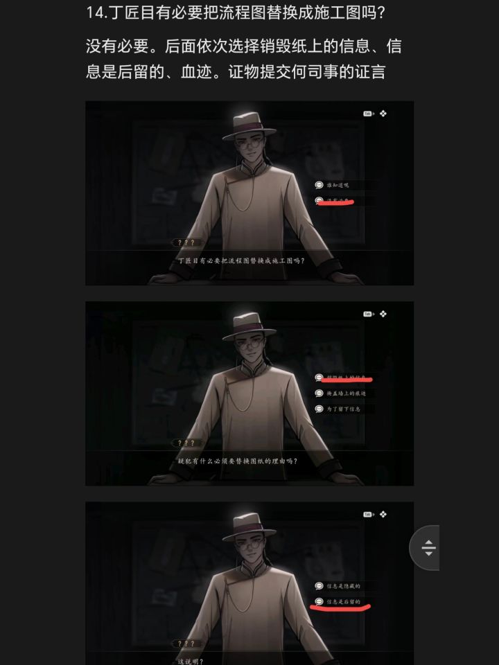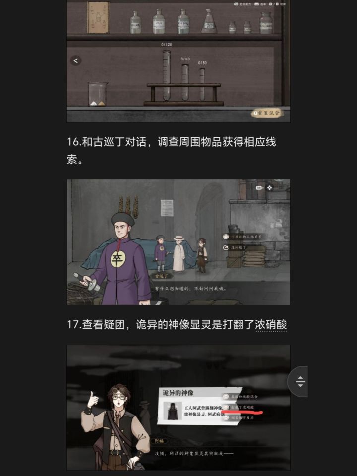 第三案 炉边祟影(接上篇)-14.丁匠目有必要把流程图替换成施工图吗?没有必要。后面依次选择销毁纸上的信息、信息是后留的、血迹。证物提交何司事的证言。15.到实验台按书上顺序配试剂。16.和古巡丁对话,调查周围物品获得相应线索。17.查看疑团,诡异的神像显灵是打翻了浓硝酸。18.和学徒阿武对话,之后上二层平台,和工人老李对话,出示吊钩证物。调查周围物品之后下楼,和古巡丁对话。19