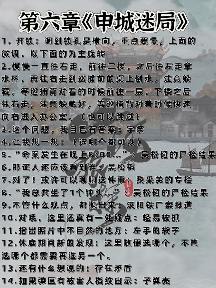 第六章《申城迷局》1. 开锁:调到锁孔是横向,重点要慢,上面的微调,以下面的为主旋转2.慢慢一直往右走,前往二楼,之后往左走拿水杯,再往右走到巡捕前的桌上倒水,注意躲藏,等巡捕背对着的时候前往一层,下楼之后往右走,注意躲藏好,等巡捕背对着时候快速向右进入办公室。(也可以跳过)3.这个问题,我自己有答案:字条4.让我想一想:(选哪个都可以)5.“命案发生在晚上8:00……”:吴松韬的尸检结