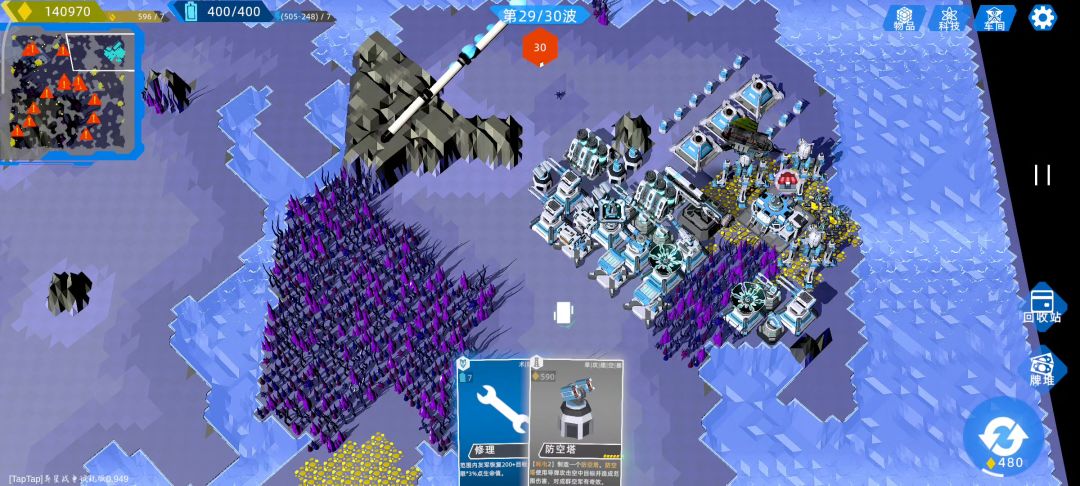 种子86944602,这个种子右下角有巨大的发展空间,左上大矿在一个孤岛上方便天罚偷 前10波的核心目标就是凑出一张点金来复制,如果其他系列的权重都不够解锁五星卡牌,10波开始时的商店几乎必定有精炼和基站,超空间矿机和能量核心能造就造,早一点滚起雪球来划算的多,能量塔和挖掘塔也挺容易出的,商店也有卖 10到20波就是不停的扩张电力与经济,如果到15波脸黑都没刷到离子炮跟狙击塔,直接去科技里买,保证