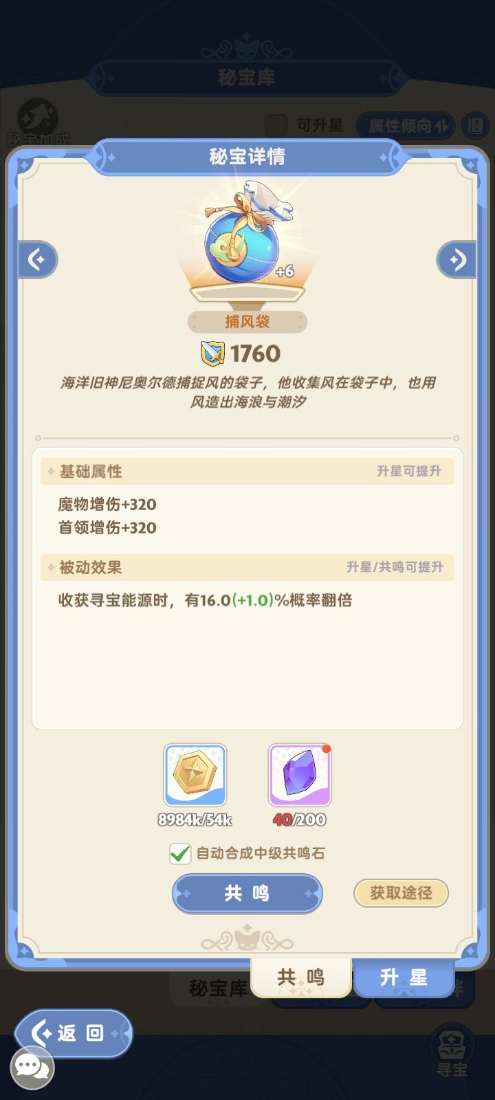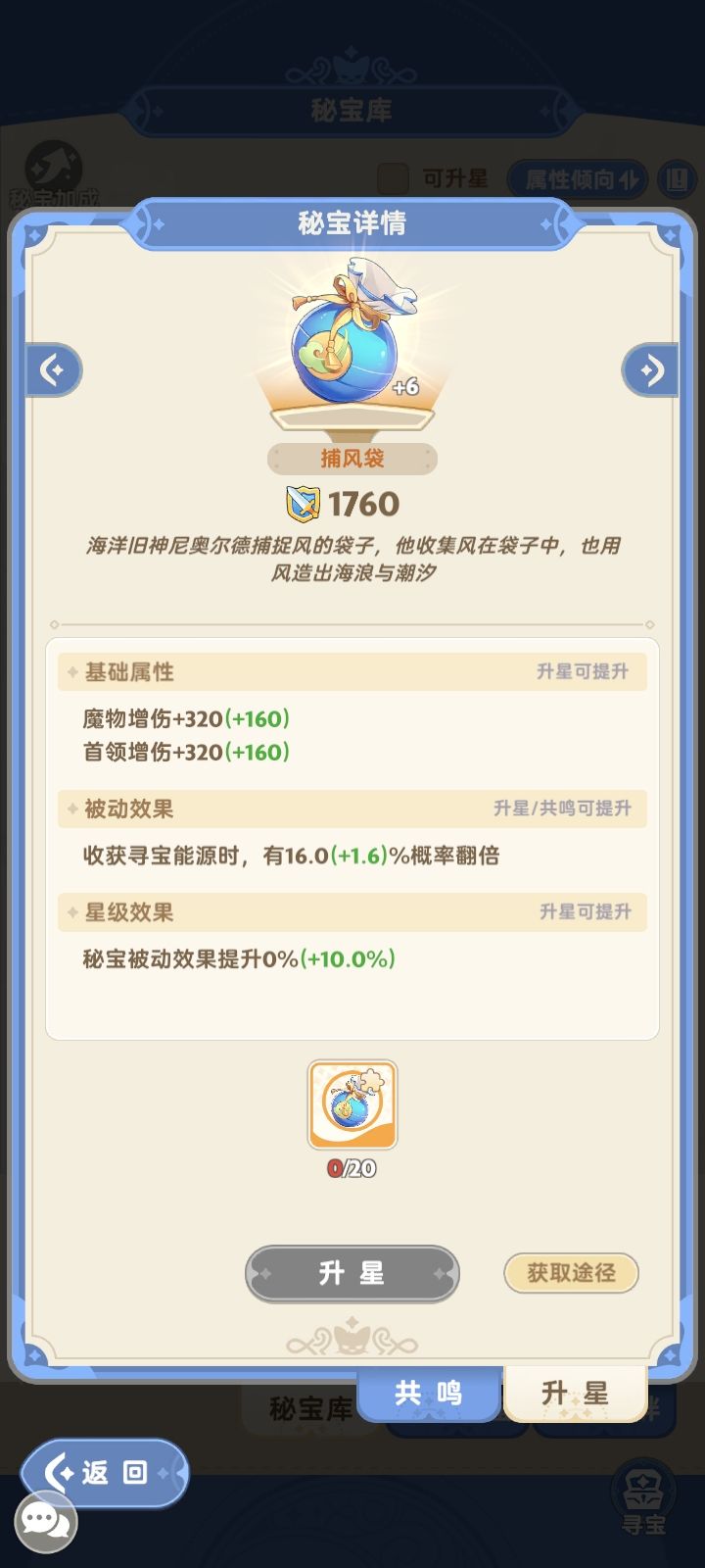 捕风袋属性如图,刚拿到的概率是10%升级1次加1%,10级捕风袋是20%概率捕风袋重要吗?对于打算长期玩两三个月甚至半年以上的人来说,确实是比较重要的道具但是他又没那么重要,至少不会重要到神化的地步,短时间内捕风袋的差距是体现不出来的,至少也得一两个月后才能有一点差距,而且这个差距还会被运气拉的更小没有捕风袋的人至少一两个月之内都不会跟其他人有很明显差距(氪金除外)所以其实不是很必要弄不