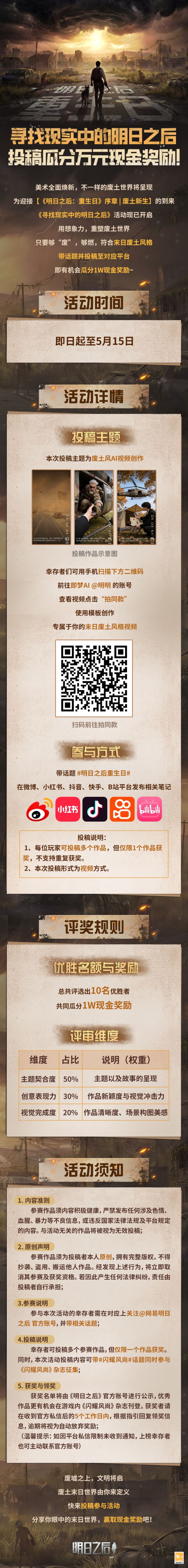 从开荒,到定义。4月16日,废土迎来新生序章! 明日之后:重生日版本现已正式开启——感受极端末日天气,重塑荒凉场景氛围 参与重生日版本活动,领取限定时装、金核芯自选等大量福利! 即刻下载体验焕新后的废土世界! #明日之后重生日