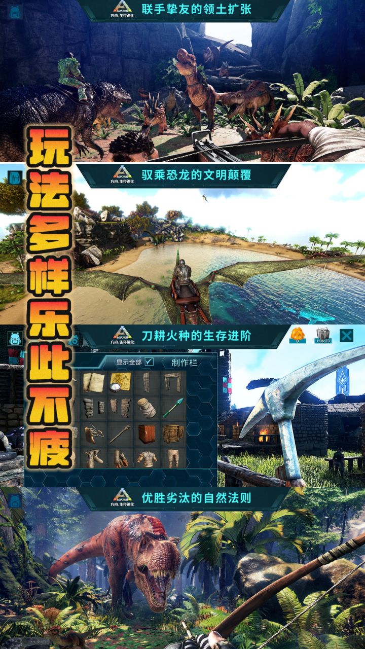 恐龙,原始社会,不一样的天花板级别生存游戏,不吹不黑,在国外一直🔥。就是不手机版的不能和电脑版的可以打模块,不然玩法直接拉满不过就算可以,手机也顶不住啊《方舟:生存进化》手游版是-款大型生存探索沙盒手游,由Wildcard工作室原班欧美团队研发,依托虚幻4引擎,高品质还原了端游的所有玩法。在Steam上发布,48小时售出20万套领跑Steam销量榜,受到全球玩家热捧