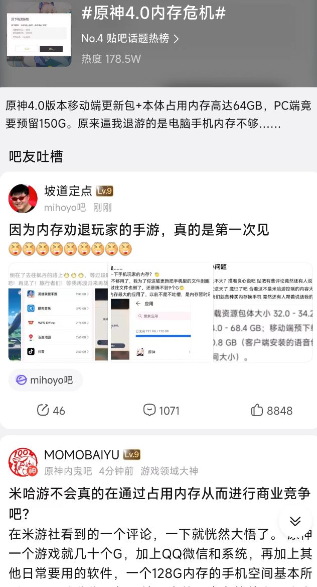 《原神》枫丹版本今天更新,但4.0移动端包体+解压需要用到64GB内存,PC端则是150G,不少人的设备完全顶不住,引发不少吐槽。实测装完之后占用35G。#枫丹
