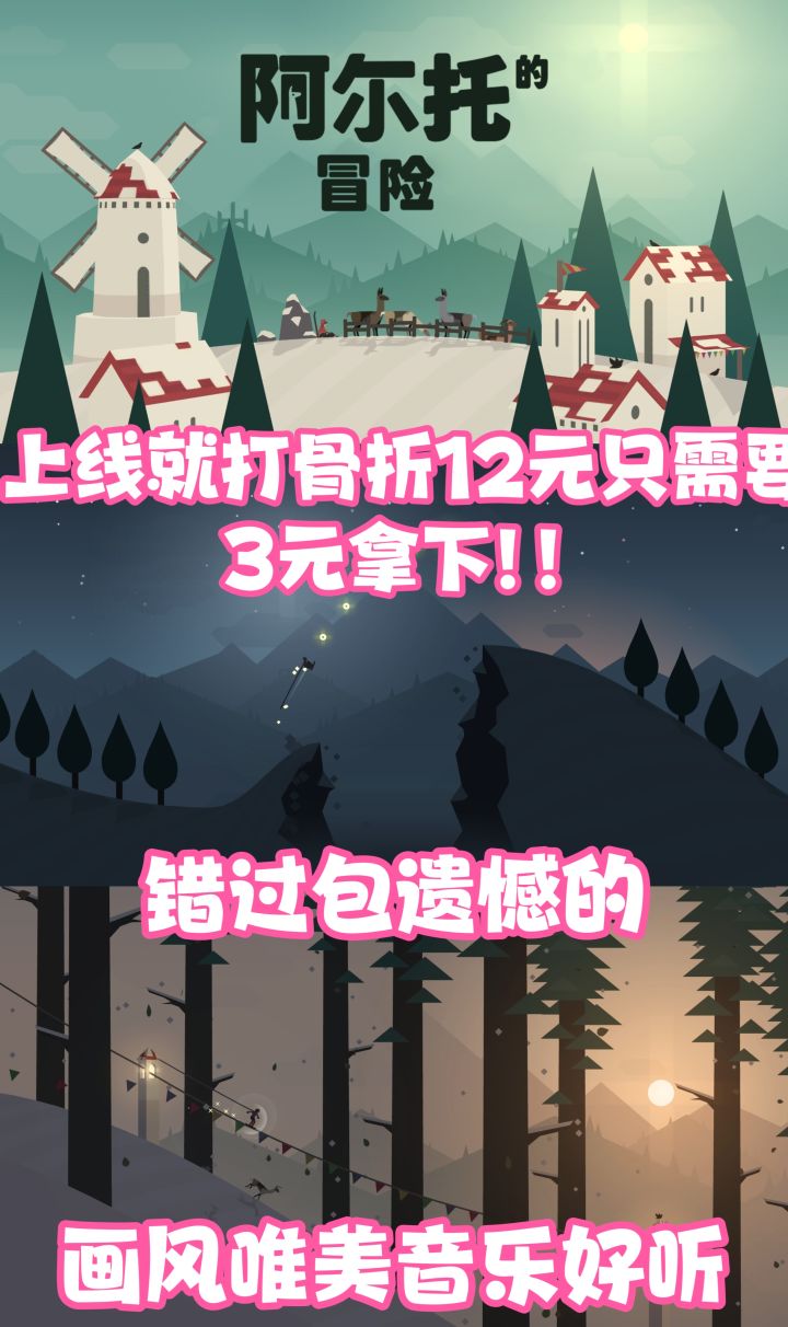 🎿三款滑雪跑酷游戏:《滑雪大冒险》《阿尔托的冒险》《阿尔托的奥德赛》。常有人质疑阿尔托系列有“抄袭”之嫌。但我想说,游戏不能仅以玩法雷同就判定其雷同,以玩过类似游戏而放弃新游戏,其实是对游戏这一第九艺术的窄化认知。 一个游戏的好坏,应从它能给予玩家的情绪价值来评判。就比如《穿越火线》与《CS》,同属枪战竞技类游戏,旁边兄弟CS 还在匹配对手时,我用穿越火线已经开始“踏踏踏”“佛爱儿惹火