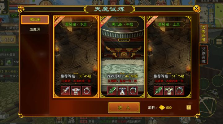 热血江湖手游是一款多人在线、角色扮演、MMORPG类型的游戏。游戏里有众多的玩法和特色。在游戏中,就有一种比较好玩的副本,需要玩家达到一定实力才可以去挑战。下面就由我小鱼儿来给大家介绍一下热血江湖手游中具有挑战性的玩法——天魔试炼。天魔试炼通过游戏内上方的标签就可以打开看到了。天魔试炼中分为不同的副本,每个副本进入要求和难度各不相同。其中黑风阁分为下层、中层及上层。每层都可爆出神品级的装备,且爆