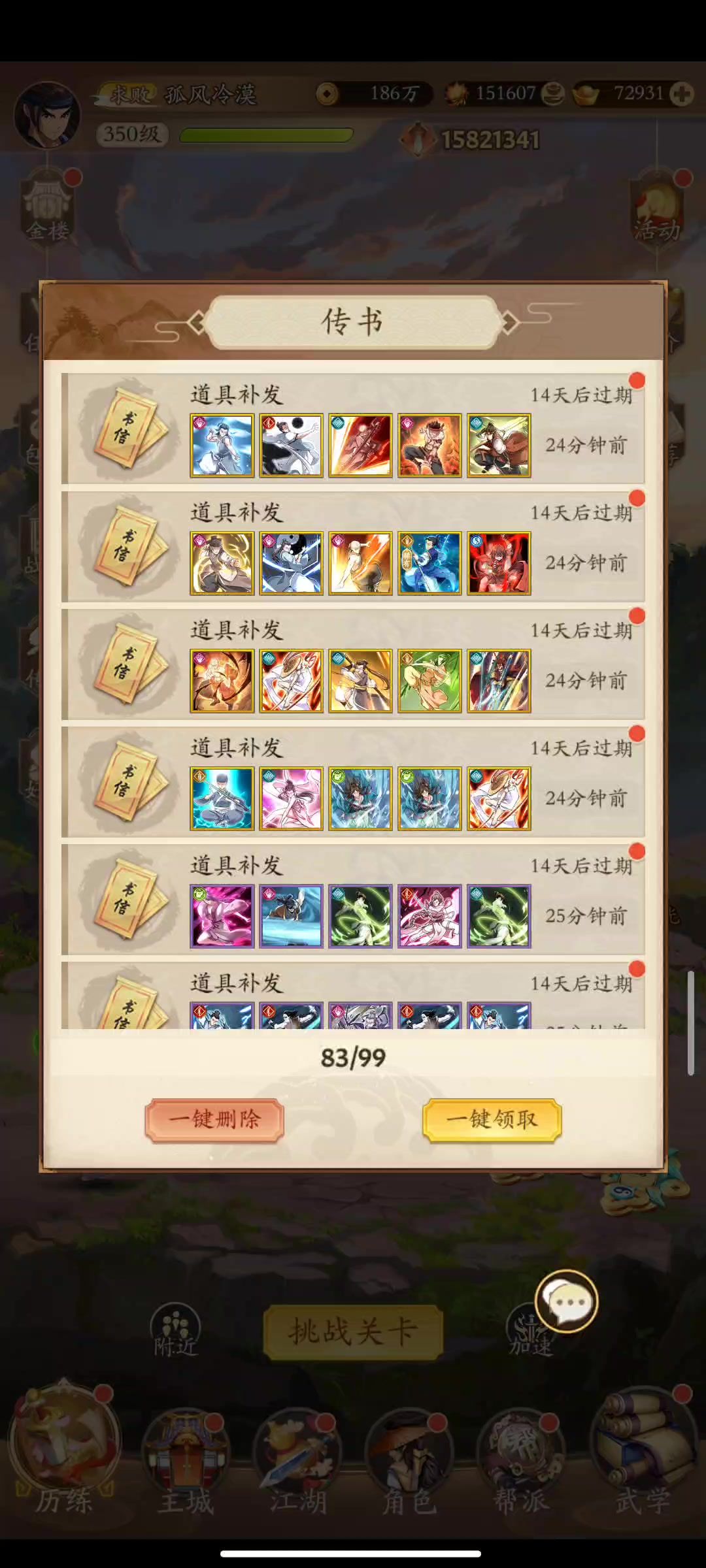 至此,我背包能强化的都强化了,一开始武学一套战力200w,现在有240w了,除了装备没打好,别的提了不少了。放两张属性图大家就清楚了。至于木人巷嘛,之前700层爬到1400多,还能爬,但是近期没空打了,而且我上个帖子说了给大家看后续也拖的够久了,所以就这样了,两百多本绝学武功。 好好像是开了两本绝世,然后五本稀有,此频最后面那一格子全是稀有的,是用的稀有碎片合的,那个不算。爆率还可以吧,两百多本,