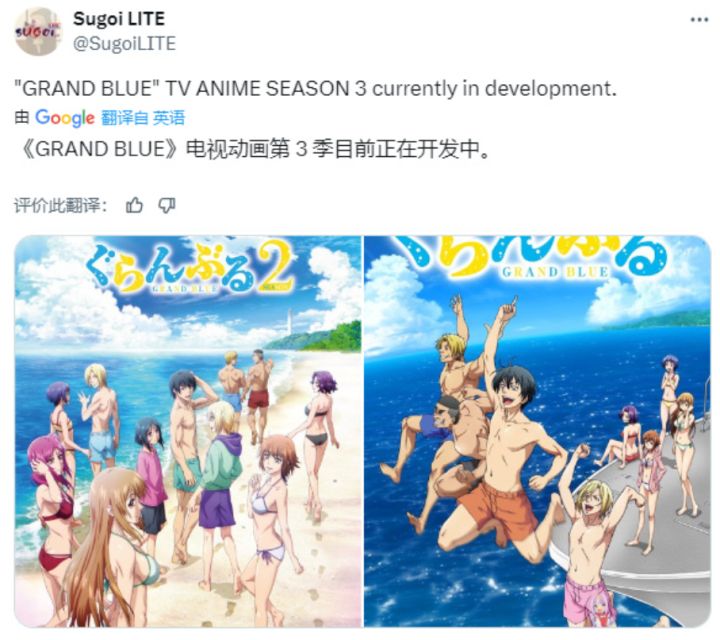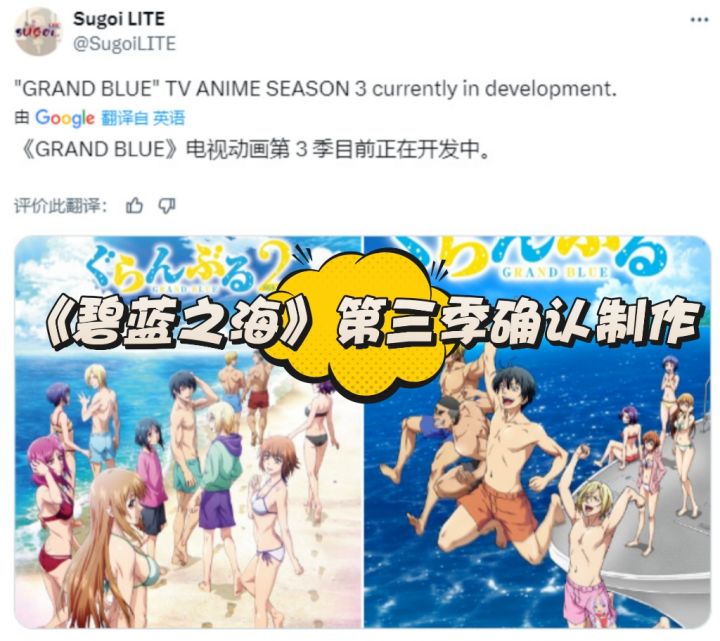 近日,官方宣布搞笑题材动漫《GRAND BLUE 碧蓝之海 第二季》将于7月7日开播,并宣布片头主题曲将采用由湘南乃风 feat. ATARASHII GAKKO!(新学校领袖)演唱的《青春永远》。#生活杂谈 #杂谈 #动漫 #动漫头像 #碧蓝之海 #搞笑