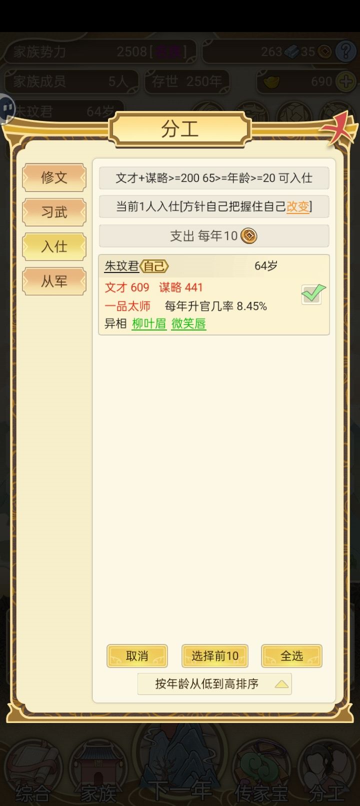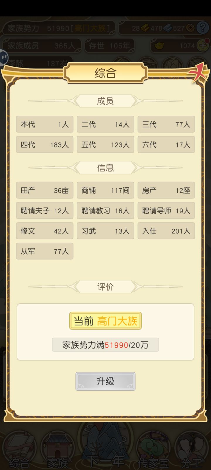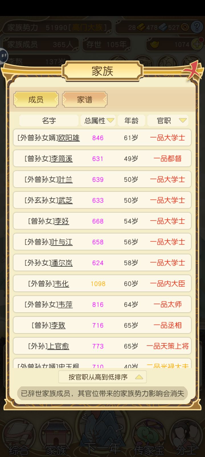 家族传承了百年,终于出了两个一品大员,分别是文官一品和武官一品,真心不容易,跟现实中一个家族要腾飞也需要三代人努力是一样的#今天摸鱼玩点啥#游戏安利#祖宗模拟器
