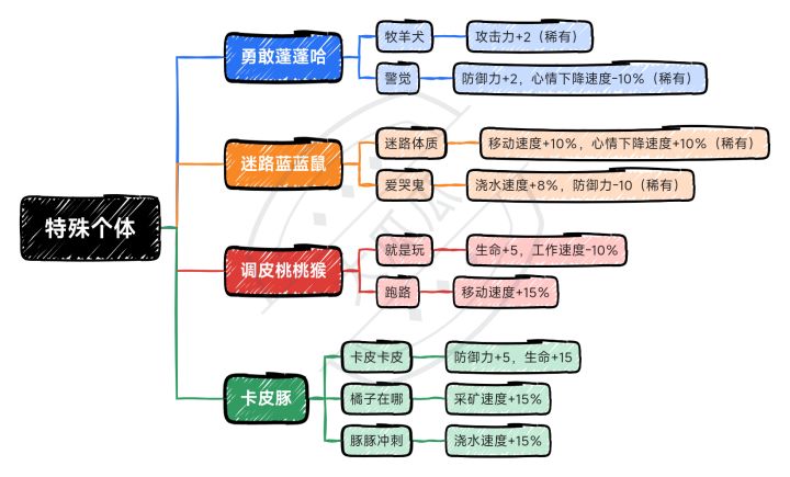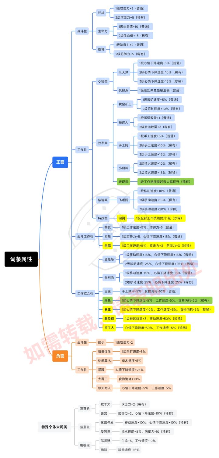 玩了3天目前我知晓的所有词条都在这里了,欢迎大家补充。部分工作性单项百分比词条基数为2级为1级2倍,3级为1级3倍,可能我比较黑,没见过。部分词条解释:心情下降速度负为增益,正为减益工作速度正为增益,负为减益食物消耗负为增益,正为减益移动速度正为增益,负为减益。绿色表示1级稀有,黄色表示1级珍稀。#米姆米姆哈 #米姆米姆哈测试资格 #米姆米姆哈内测 #米姆米姆哈测试