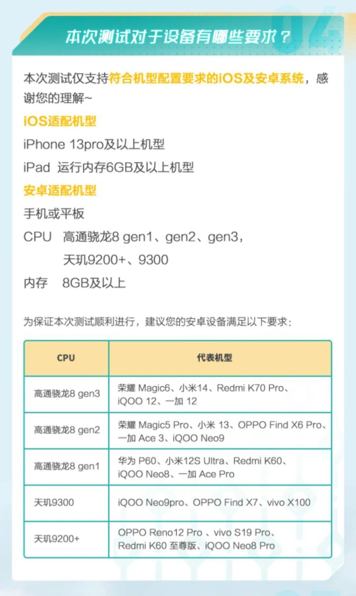 🐜测试机型配置 🐼iOS适配机型iPhone 13pro及以上机型iPad 运行内存6GB及以上机型🐙安卓适配机型手机或平板CPU 高通骁龙8 gen1、gen2、gen3,天玑9200+、9300内存8GB及以上#游戏种草计划 #荒野起源 #荒野起源全球预约