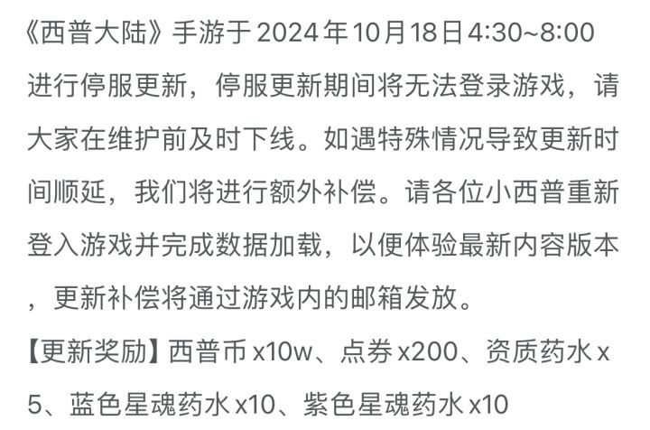 亲爱的小西普们:《西普大陆》手游将于2024年10月11日4:30~8:00进行停服更新,停服更新期间将无法登录游戏,请大家在维护前及时下线。如遇特殊情况导致更新时间顺延,我们将进行额外补偿,具体补偿内容请见后续公告。更新完成后将开启新活动-永不言败 闪电蝎的骄傲!请各位小西普重新登入游戏并完成数据加载,以便体验最新内容版本,更新补偿将通过游戏内的邮箱发放。更新补偿:西普币x10w、自动战斗
