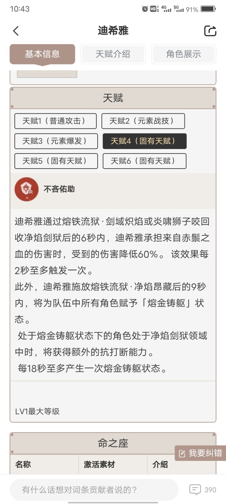 迪希雅技能机制 产球及元素附着实测 元素战技「熔铁流狱」 每次协同攻击产1球,附着为标准2.5s/3hit,首次施放领域(净焰昂藏)与再次释放领域(剑域炽焰)的附着相互独立并无内置冷却 胡桃元素战技消耗自身的生命值不会被赤鬃之血消解,即迪希雅不会承受前台角色自伤 锁面板 元素爆发「炎啸狮子咬」 炽鬃拳附着为标准2.5s/3hit,焚落踢独立附着 一次元素爆发大约能打出10次炽鬃拳和1次焚落踢,